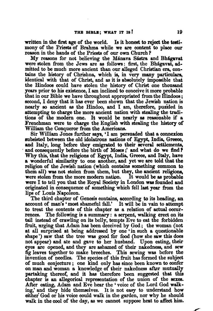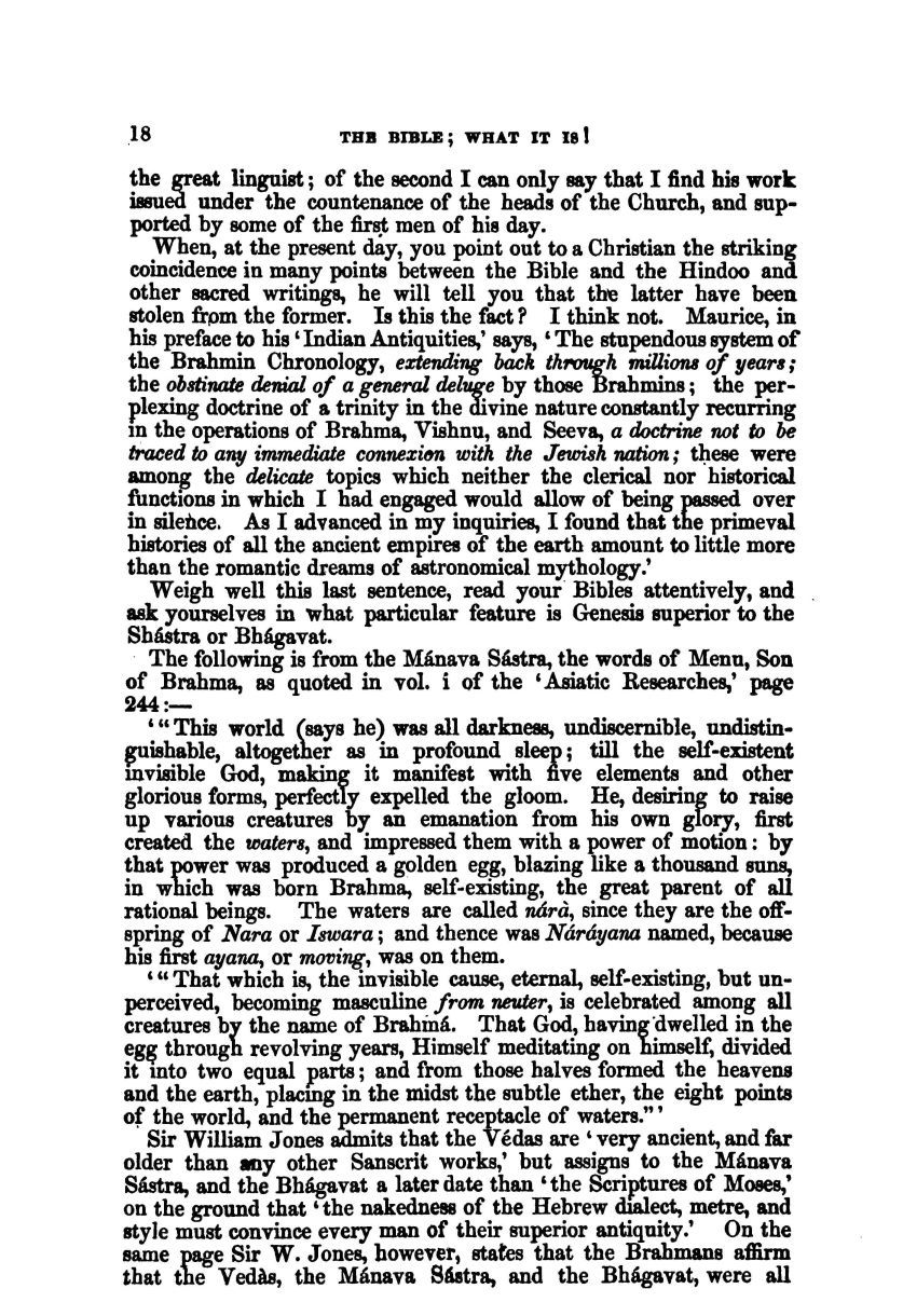 Having passed through the two accounts of the creation contained in the anonymous book I am examining, I shall strive to ascertain the source from whence some of the doctrines and traditions contained in this book were derived. Aware of the magnitude of my task, I will now only deal with authorities to whom no exception should be taken by the religious reader. One is the pious and erudite Sir William Jones, the other the Reverend Thomas Maurice. Of the claims of the first to our attention I will say nothing, for every man ought to be more or less acquainted with the character of {pg18} the great linguist; of the second I can only say that I find his work issued under the countenance of the heads of the Church, and supported by some of the first men of his day.