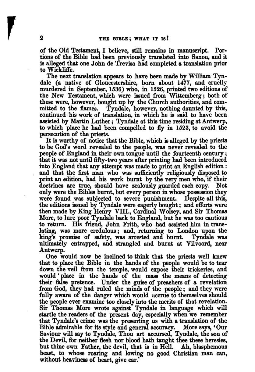 It is worthy of notice that the Bible, which is alleged by the priests to be God's word revealed to the people, was never revealed to the people of England in their own tongue until the fourteenth century; that it was not until fifty-two years after printing had been introduced into England that any attempt was made to print an English edition: and that the first man who was sufficiently religiously disposed to print an edition, had his work burnt by the very men who, if their doctrines are true, should have zealously guarded each copy. Not only were the Bibles burnt, but every person in whose possession they were found was subjected to severe punishment. Despite all this, the editions issued by Tyndale were eagerly bought; and efforts were then made by King Henry VIII., Cardinal Wolsey, and Sir Thomas More, to lure poor Tyndale back to England, but he was too cautious to return. His friend, John Frith, who had assisted him in translating, was more credulous; and, returning to London upon the king's promise of safety, was arrested and burnt. Tyndale was ultimately entrapped, and strangled and burnt at Vilvoord, near Antwerp.