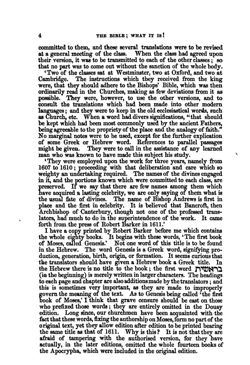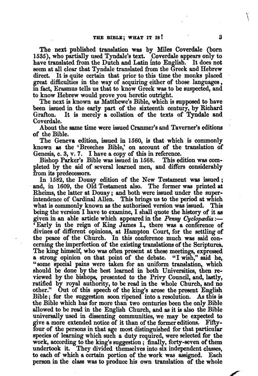 In 1582, the Douay edition of the New Testament was issued; and, in 1609, the Old Testament also. The former was printed at Rheims, the latter at Douay; and both were issued under the superintendence of Cardinal Allen. This brings us to the period at which what is commonly known as the authorised version was issued. This being the version I have to examine, I shall quote the history of it as given in an able article which appeared in the Penny Cyclopædia:—'Early in the reign of King James I., there was a conference of divines of different opinions, at Hampton Court, for the settling of the peace of the Church. In this conference much was said concerning the imperfection of the existing translations of the Scriptures. The king himself, who was often present at these meetings, expressed a strong opinion on that point of the debate. "I wish," said he, "some special pains were taken for an uniform translation, which should be done by the best learned in both Universities, then reviewed by the bishops, presented to the Privy Council, and, lastly, ratified by royal authority, to be read in the whole Church, and no other." Out of this speech of the king's arose the present English Bible; for the suggestion soon ripened into a resolution. As this is the Bible which has for more than two centuries been the only Bible allowed to be read in the English Church, and as it is also the Bible universally used in dissenting communities, we may be expected to give a more extended notice of it than of the former editions. Fifty-four of the persons in that age most distinguished for that particular species of learning which such a duty required, were selected for the work, according to the king's suggestion; finally, forty-seven of them undertook it. They divided themselves into six independent classes, to each of which a certain portion of the work was assigned. Each person in the class was to produce his own translation of the whole {pg4} committed to them, and these several translations were to be revised at a general meeting of the class. When the class had agreed upon their version, it was to be transmitted to each of the other classes; so that no part was to come out without the sanction of the whole body.