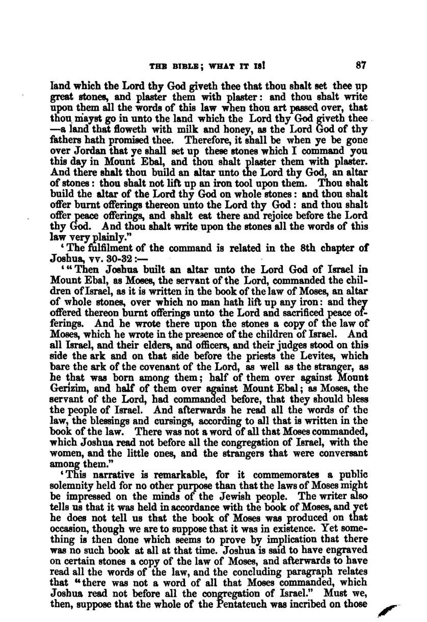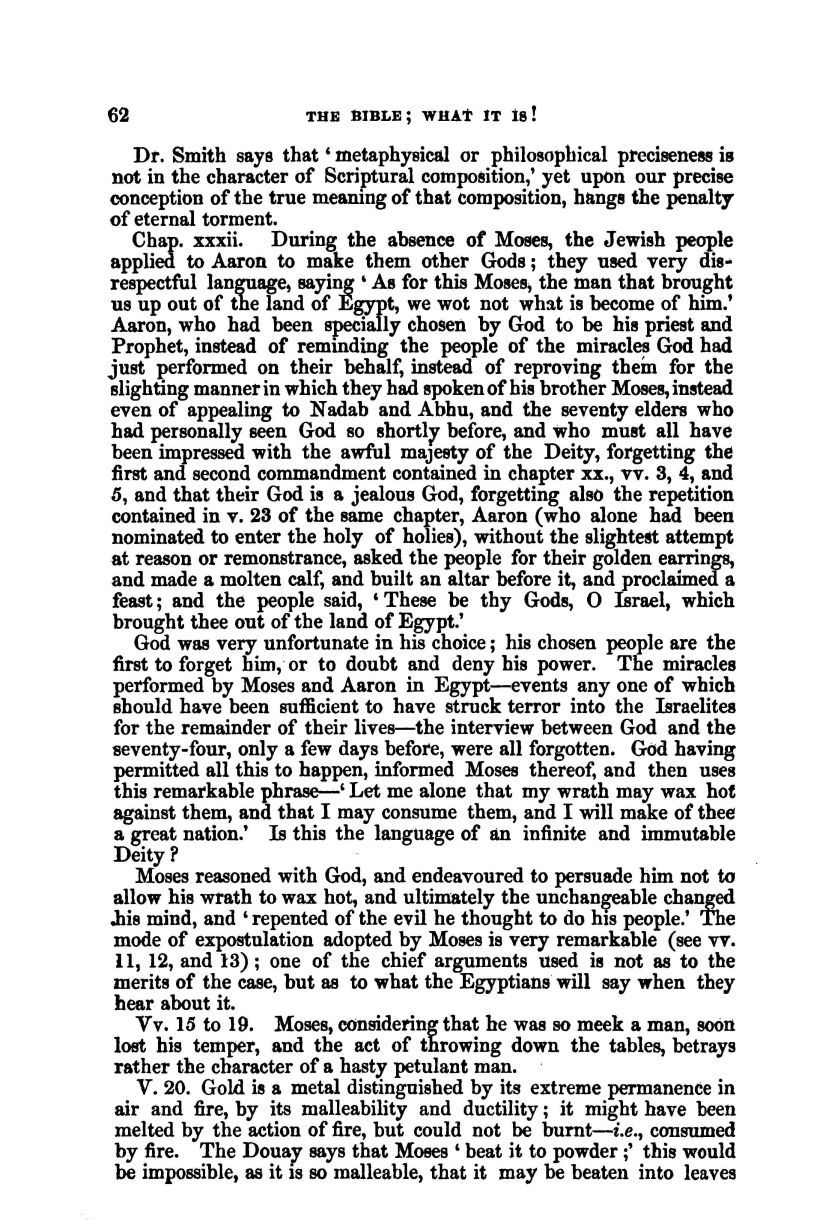 '1.—It seems difficult that Moses could have written the Pentateuch which we attribute to him, in the desert. If his people came from Egypt, where they had lived, says the author, 400 years (although he is mistaken in 200 years), the book would, probably, have been written in Egyptian, and we are told it was in Hebrew. It must have been graven upon stone or wood, because, in the time of Moses, they had no other mode of writing. This was a very difficult art, and one which required long preparations, since it was necessary to polish the wood or the stone. It does not appear that this art would have been exercised in a desert, where, according to the book itself, the Jewish horde were not able to make their own clothes and shoes, and where God was obliged to work a continual miracle during forty years to preserve their vestments without decaying, and the coverings of their legs and feet. It is so true that they were only able to write upon stone, that the author of the book of Joshua says that Deuteronomy was written upon an altar of rough stones, plastered with mortar. It appears Joshua did not even imagine this book was durable. {pg8} '2.—Those men who are most versed in antiquity think these books were written more than 700 years after Moses. They found this opinion upon that which is spoken of the Kings of Edom and Israel, when there were no kings till a long time after Moses; upon the position of the cities, which is false if the books were written in the desert, and true if they were written at Jerusalem; upon the names of the cities and small towns of which these books speak, which were neither built nor called by the names there given them till many ages afterwards, &c.'