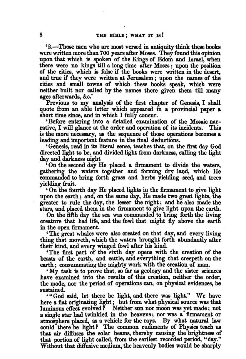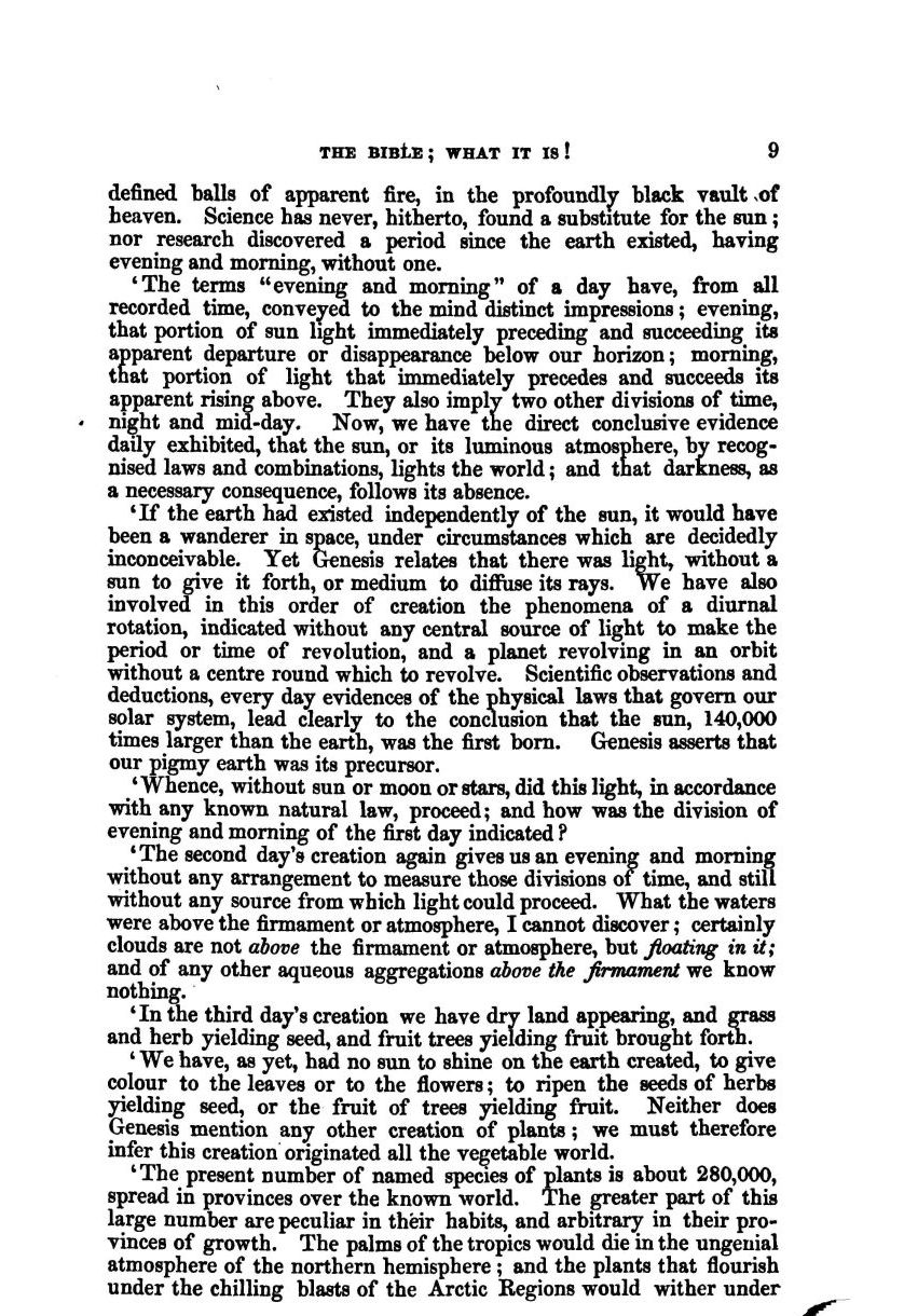 '"God said, let there be light, and there was light." We have here a fiat originating light; but from what physical source was that luminous effect evolved? Neither sun nor moon was yet made; not a single star had twinkled in the heavens; nor was a firmament or atmosphere placed, as a vehicle for the rays. By what natural law could there be light? The common rudiments of Physics teach us that air diffuses the solar beams, thereby causing the brightness of that portion of light called, from the earliest recorded period, "day." Without that diffusive medium, the heavenly bodies would be sharply {pg9} defined balls of apparent fire, in the profoundly black vault of heaven. Science has never, hitherto, found a substitute for the sun; nor research discovered a period since the earth existed, having evening and morning, without one.
