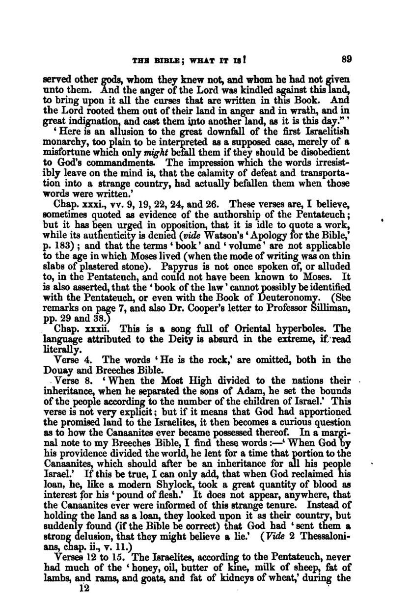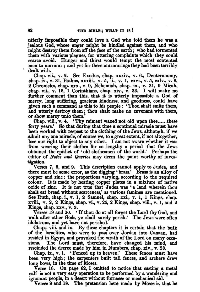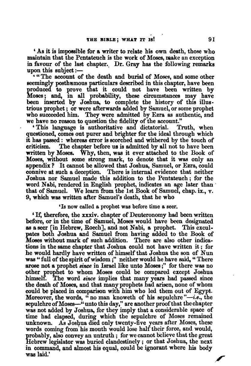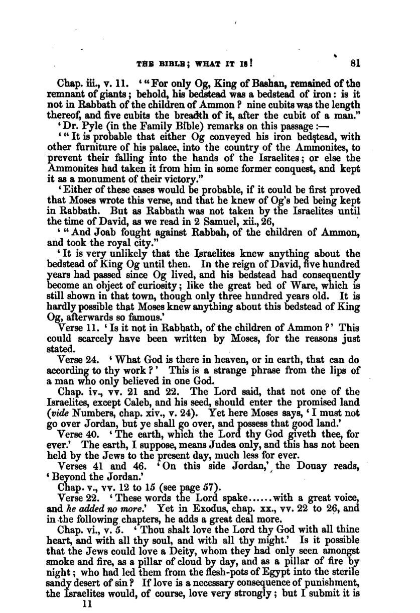 Deuteronomy, chap, xxxiii. It is scarcely probable that Moses wrote a chapter containing phrases such as 'the man of God, Moses, {pg7} blessed the Children of Israel before his death,' 'Moses commanded us a law,' &c:—Deuteronomy, chap, xxxiv. I do not consider it necessary to reason upon the proposition that a man cannot write an account of his own death and burial, or to endeavour to prove that he cannot relate that his grave remains undiscovered to the present day. Beside which, the names used in this chapter are those which were given to the places after the Israelites had obtained possession of the land, and which could not have been known in the time of Moses. The same remark applies to Deuteronomy, chap, iv., v. 43, in which the reader will at once discover a glaring anachronism, as it is impossible Bezer, Gilead, and Golan, could have been called Bezer of the Reubenites, Gilead of the Gadites, and Golan of the Mannassites, until after those tribes had conquered and taken possession of Bezer, Gilead, and Golan respectively, which they did not do until after the death of Moses.