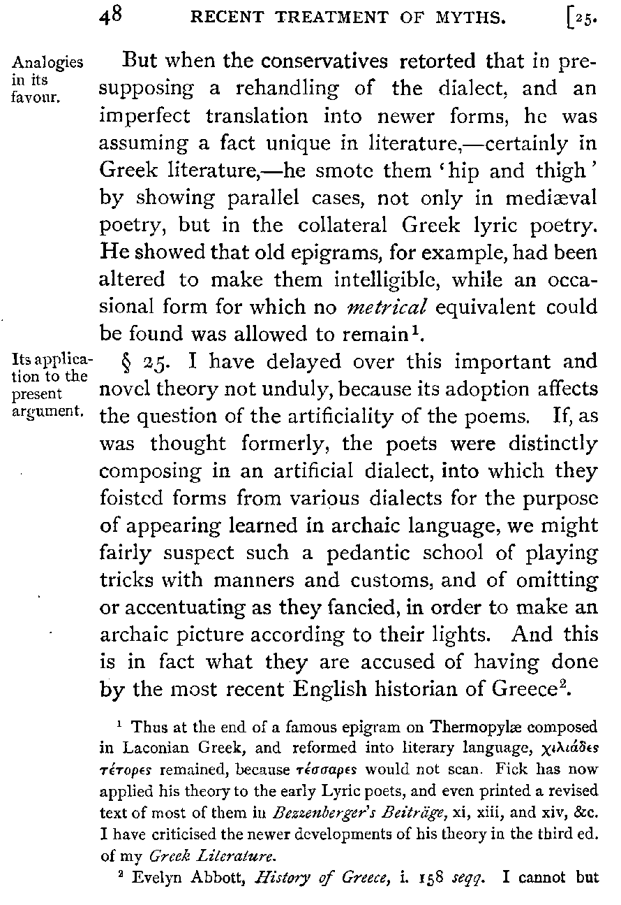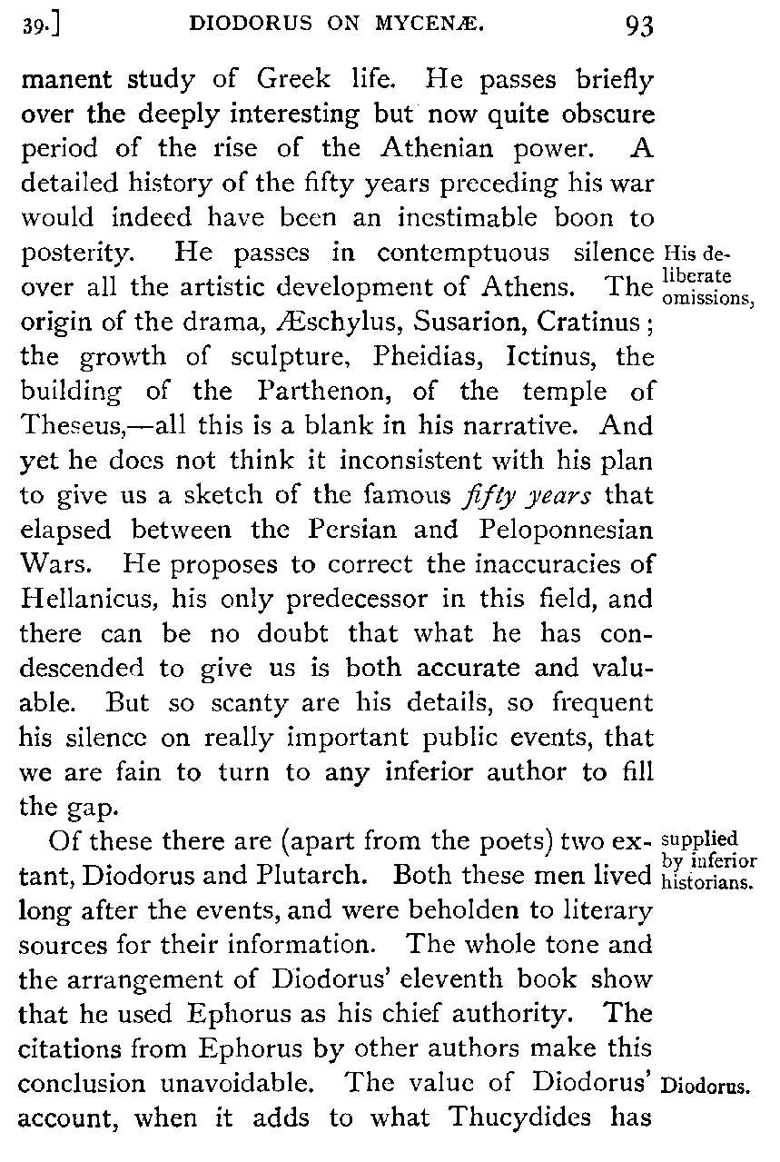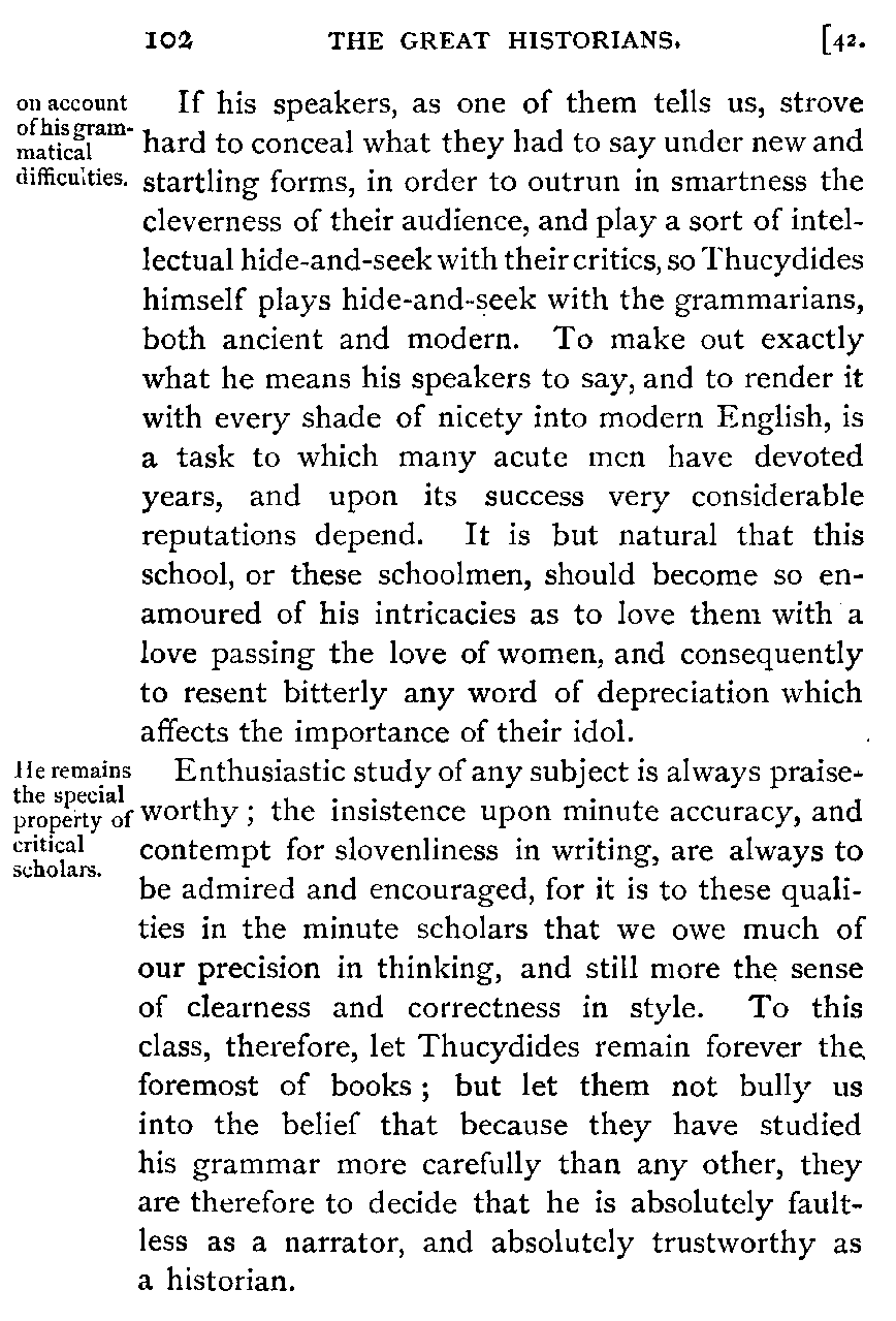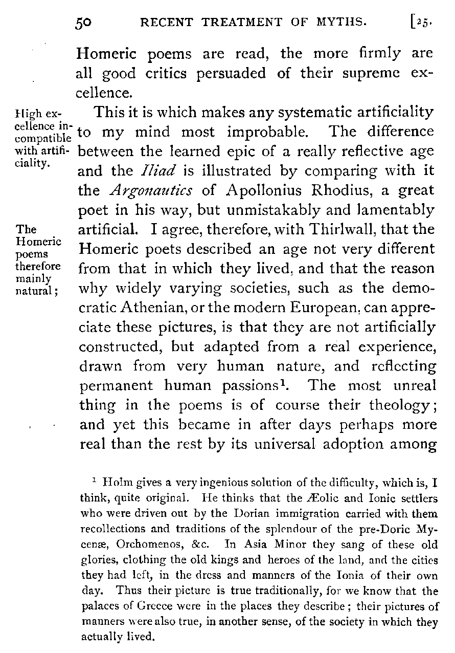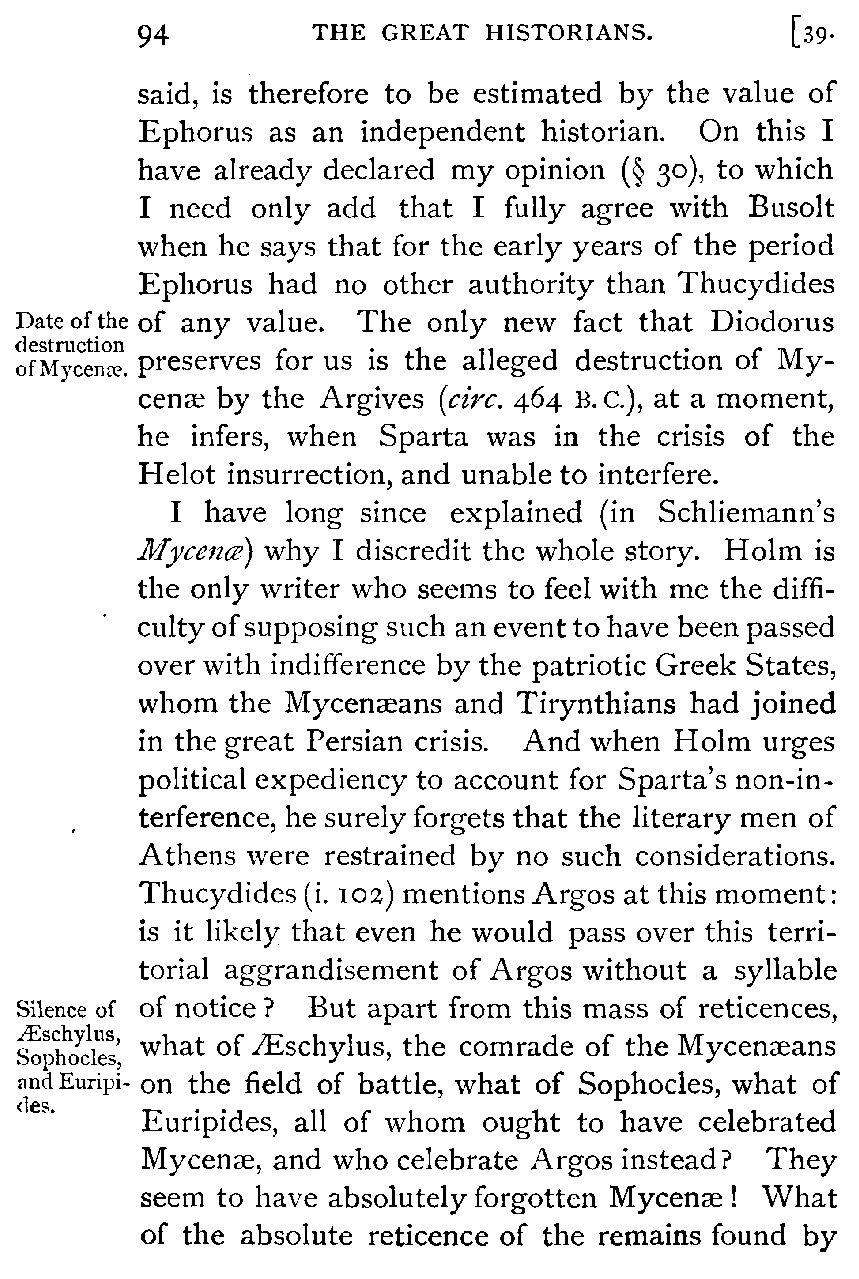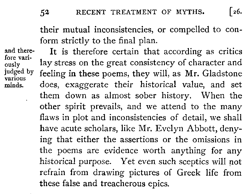 I think the case of Thucydides to be closely analogous to that of Aristotle. On all historical matters within the reach of proper inquiry, I hold him to have been thoroughly critical. But when we go back to the legends such as the Siege of Troy, or the story of Tereus and Procne, I think he laid aside all this caution, and [240]contented himself with a very modest rationalism in interpreting the myths. He is most particular about the Pentekontaetia, and Hellanicus' mistakes, but tells us calmly of events sixty years after the Trojan War, or 300 years before the Greeks went to Sicily. These matters stood with him on a different footing from that of his researches, just as our Bible history is honestly accepted by many scientific men of very sceptical turn in their special studies. They acquiesce in Scriptural evidence as a matter of general consent.