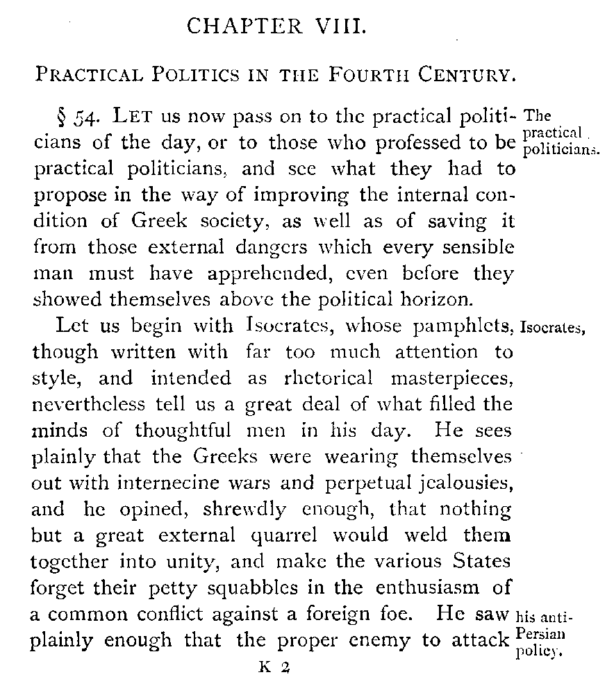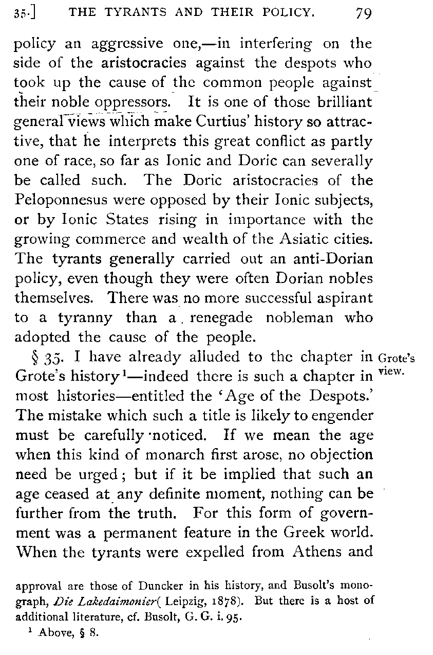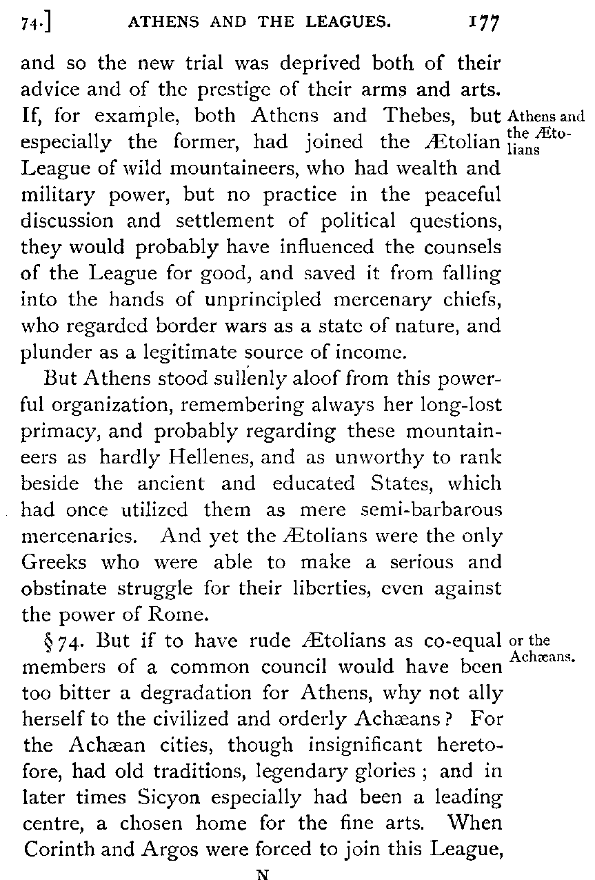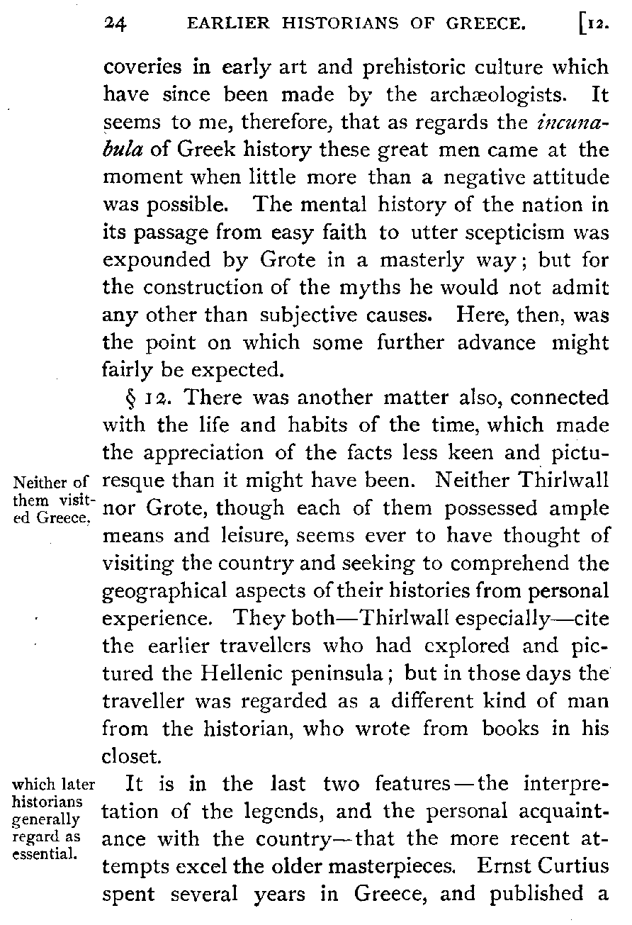 § 91. I said at the opening of this essay that I should endeavour to indicate the principal problems to be solved by future historians of Greece,—at least by those who have not the genius to recast the whole subject by the light of some great new idea; and in so doing, particular stress has been laid on the political side, not without deliberate intention. For, in the first place, this aspect of Greek affairs is the peculiar province of English historians. [208]They, with their own experiences and traditions of constitutional struggles, cannot but feel the strongest attraction towards similar passages in the life of the Greeks, so that even the professional scholar in his study feels the excitement of the contested election, the glow of the public debate, when he finds them distracting Athens or Ægion. The practical insight of a Grote or a Freeman leads him to interpret facts which may be inexplicable or misleading to a foreign student. Even with Grote before him, Ernst Curtius or Duruy is sometimes unable to grasp the true political situation.