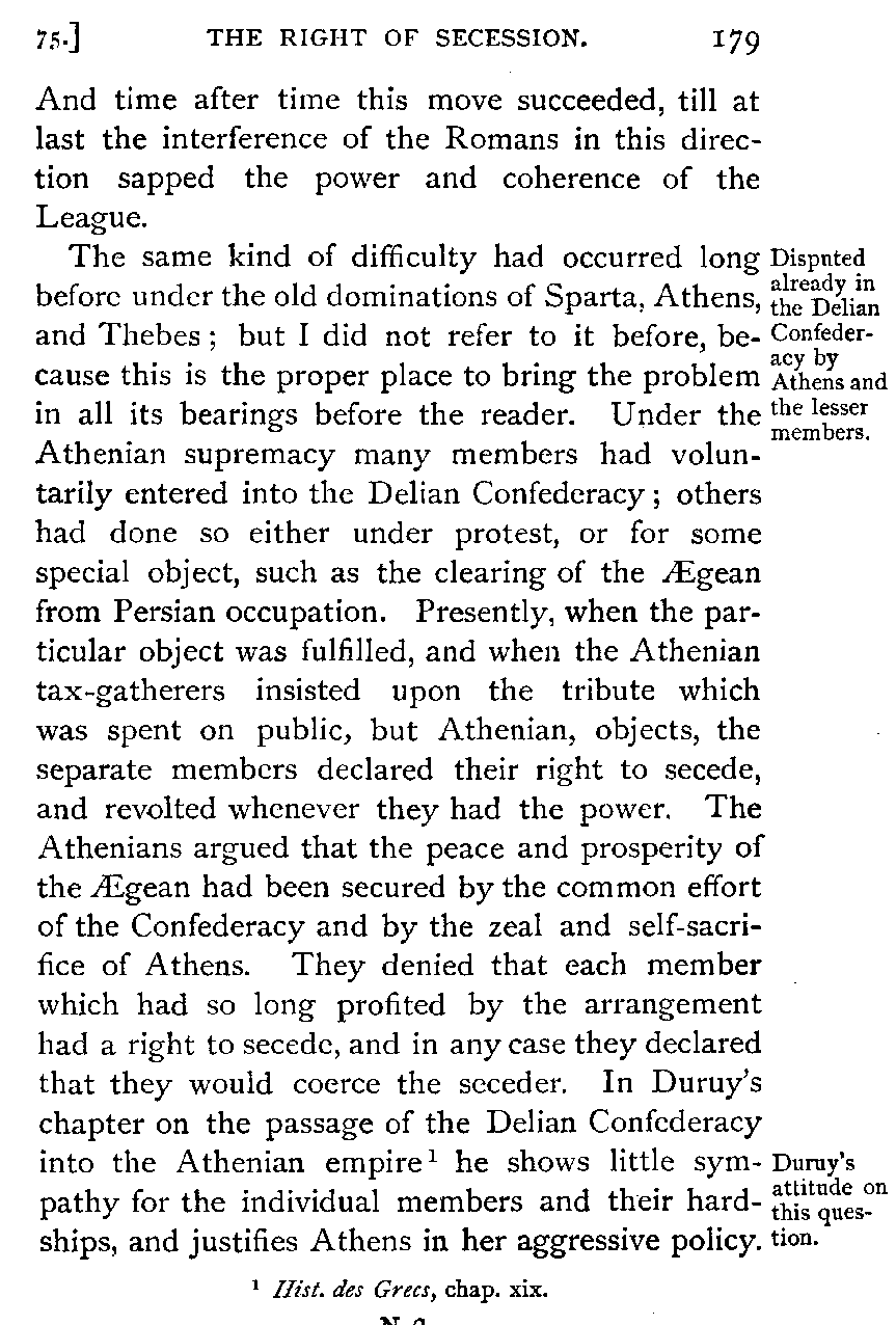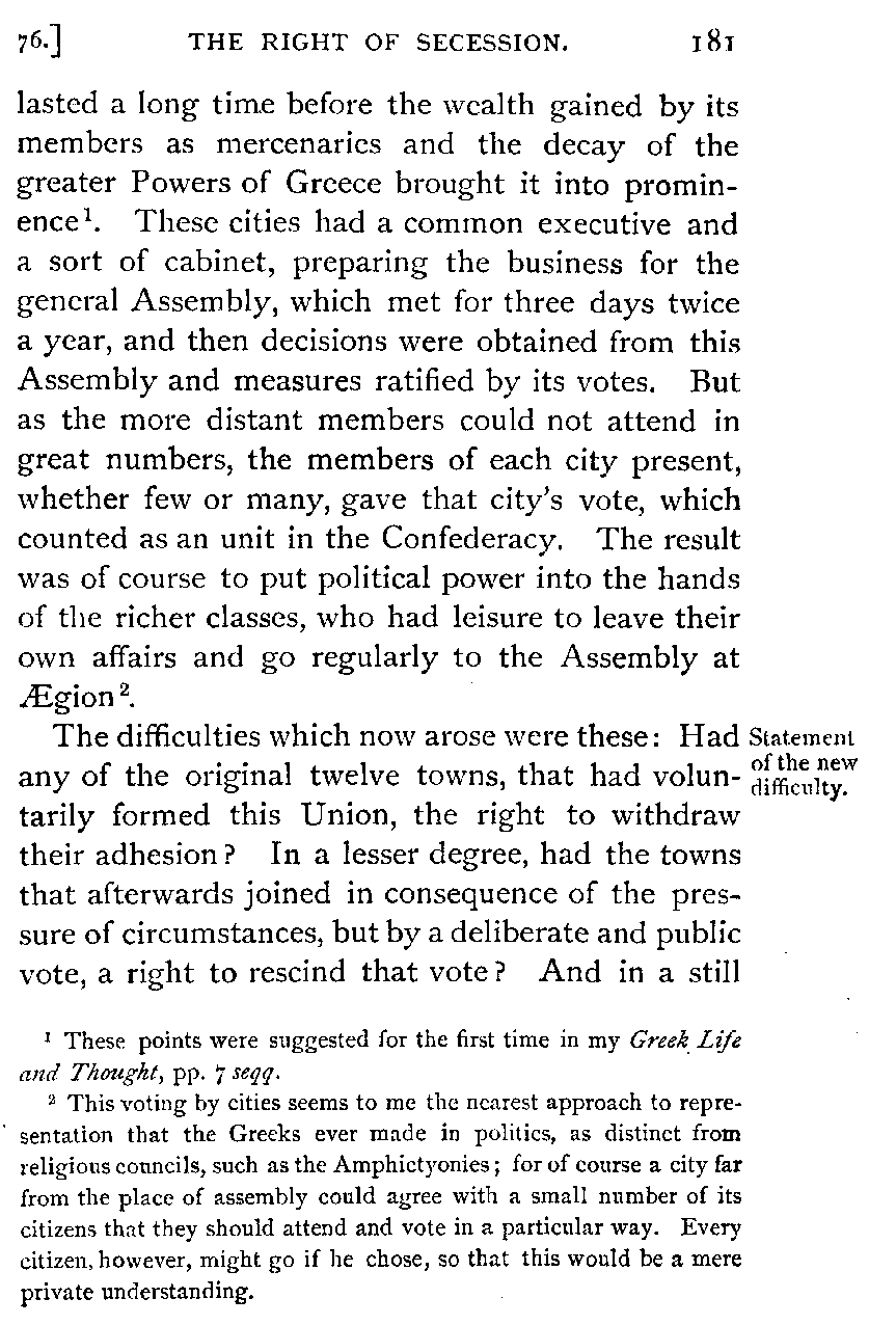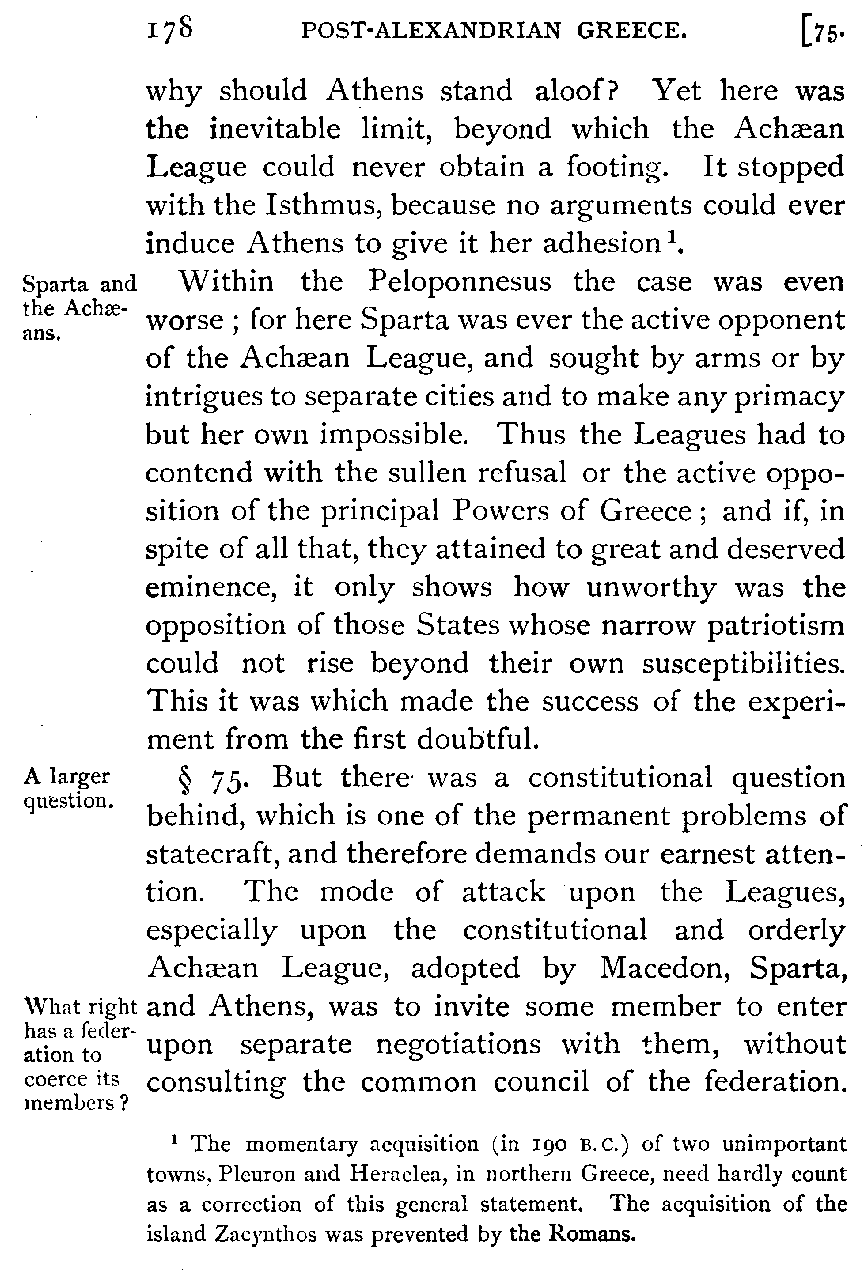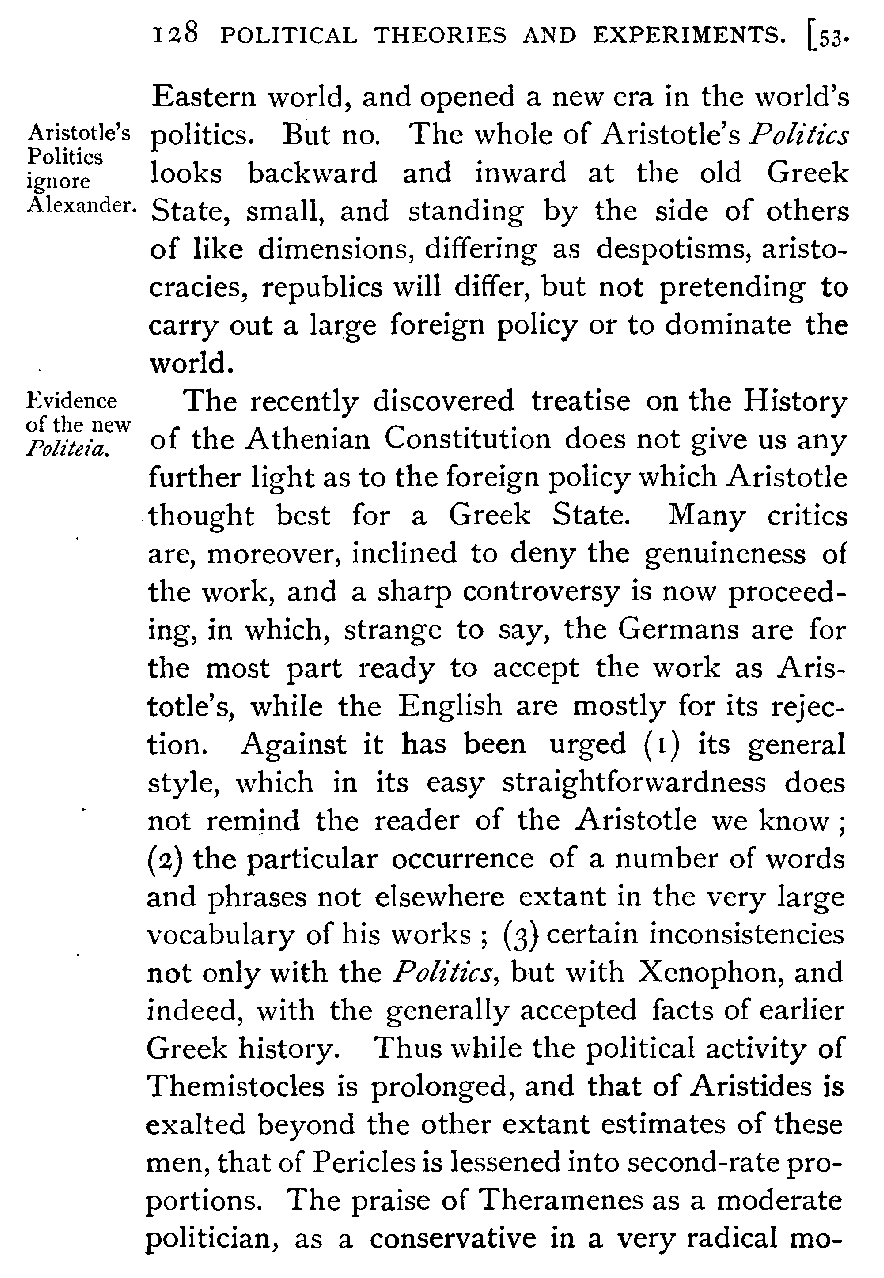 § 91. I said at the opening of this essay that I should endeavour to indicate the principal problems to be solved by future historians of Greece,—at least by those who have not the genius to recast the whole subject by the light of some great new idea; and in so doing, particular stress has been laid on the political side, not without deliberate intention. For, in the first place, this aspect of Greek affairs is the peculiar province of English historians. [208]They, with their own experiences and traditions of constitutional struggles, cannot but feel the strongest attraction towards similar passages in the life of the Greeks, so that even the professional scholar in his study feels the excitement of the contested election, the glow of the public debate, when he finds them distracting Athens or Ægion. The practical insight of a Grote or a Freeman leads him to interpret facts which may be inexplicable or misleading to a foreign student. Even with Grote before him, Ernst Curtius or Duruy is sometimes unable to grasp the true political situation.