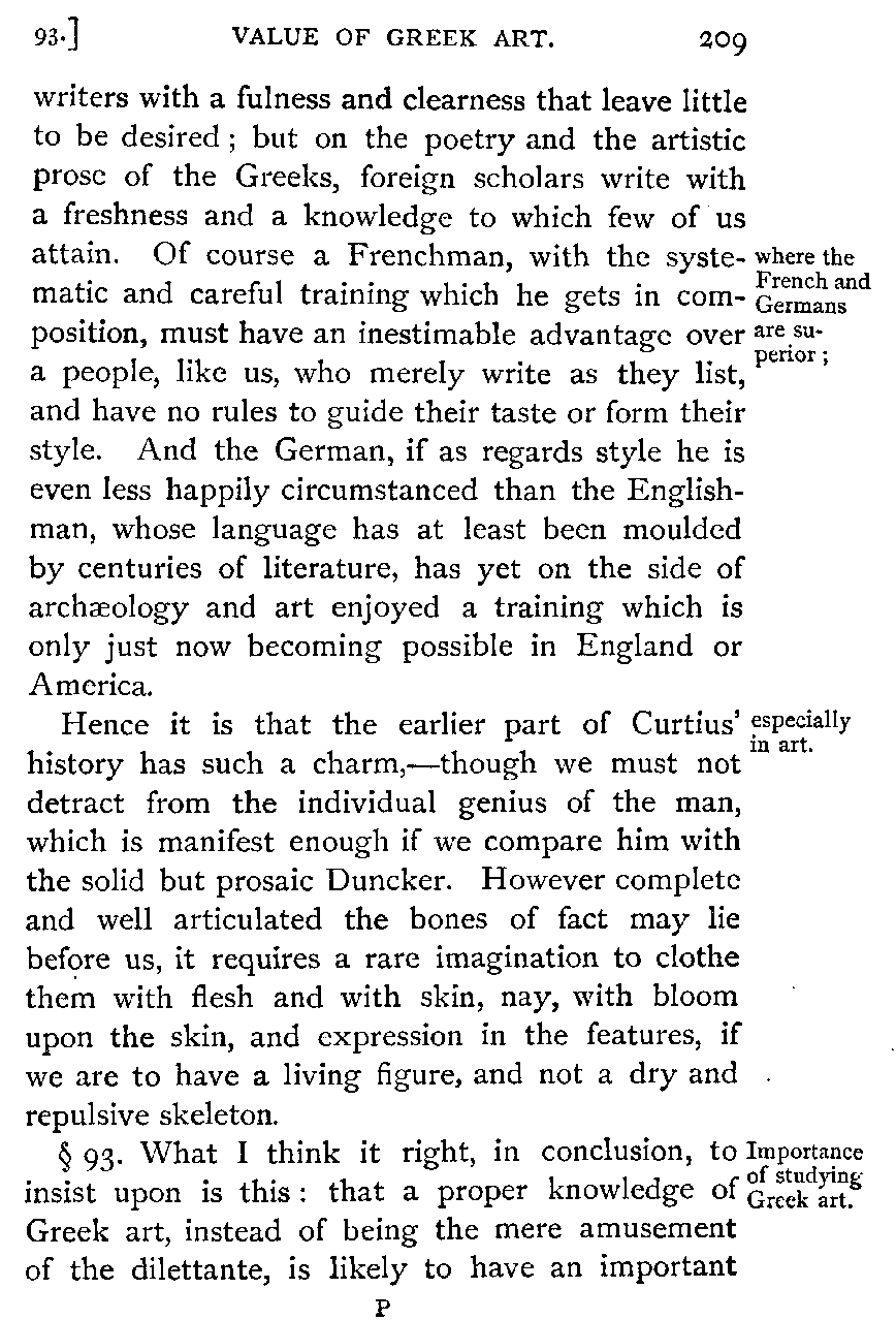 § 92. When we come to the literary and artistic side, the foreign historians have a decided advantage. The philosophical side of Greek literature has indeed been treated by Grote and other English [209]writers with a fulness and clearness that leave little to be desired; but on the poetry and the artistic prose of the Greeks, foreign scholars write with a freshness and a knowledge to which few of us attain. Of course a Frenchman, with the systematic and careful training which he gets in composition, must have an inestimable advantage over people, like us, who merely write as they list, and have no rules to guide their taste or form their style. And the German, if as regards style he is even less happily circumstanced than the Englishman, whose language has at least been moulded by centuries of literature, has yet on the side of archæology and art enjoyed a training which is only just now becoming possible in England or America.