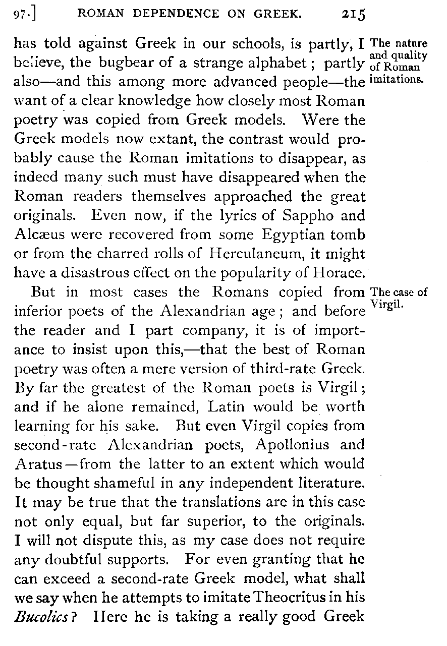 But in most cases the Romans copied from inferior poets of the Alexandrian age; and before the reader and I part company, it is of importance to insist upon this,—that the best of Roman poetry was often a mere version of third-rate Greek. By far the greatest of the Roman poets is Virgil; and if he alone remained, Latin would be worth learning for his sake. But even Virgil copies from second-rate Alexandrian poets, Apollonius and Aratus—from the latter to an extent which would be thought shameful in any independent literature. It may be true that the translations are in this case not only equal, but far superior, to the originals. I will not dispute this, as my case does not require any doubtful supports. For even granting that he can exceed a second-rate Greek model, what shall we say when he attempts to imitate Theocritus in his Bucolics? Here he is taking a really good Greek [216]poet for his model, and how poor is the great Roman in comparison! Even therefore in imitating an Alexandrian master, we can see that the first of Latin poets cannot bear the comparison.