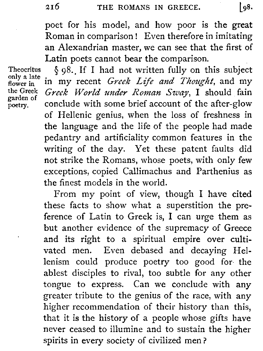 § 98. If I had not written fully on this subject in my recent Greek Life and Thought, and my Greek World under Roman Sway, I should fain conclude with some brief account of the after-glow of Hellenic genius, when the loss of freshness in the language and the life of the people had made pedantry and artificiality common features in the writing of the day. Yet these patent faults did not strike the Romans, whose poets, with only few exceptions, copied Callimachus and Parthenius as the finest models in the world.