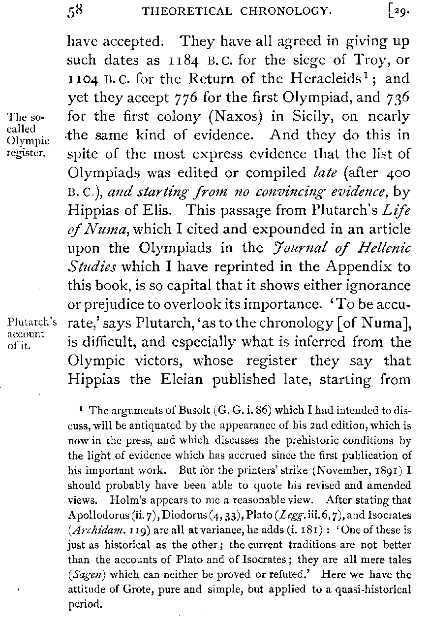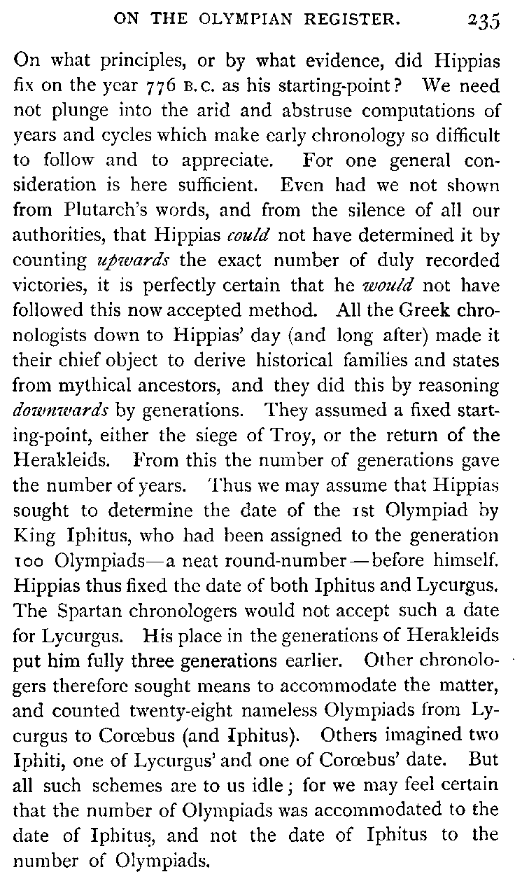 (3) I come to the last and most important point; indeed it was this which suggested the whole inquiry. [235]On what principles, or by what evidence, did Hippias fix on the year 776 B.C. as his starting-point? We need not plunge into the arid and abstruse computations of years and cycles which make early chronology so difficult to follow and to appreciate. For one general consideration is here sufficient. Even had we not shown from Plutarch's words, and from the silence of all our authorities, that Hippias could not have determined it by counting upwards the exact number of duly recorded victories, it is perfectly certain that he would not have followed this now accepted method. All the Greek chronologists down to Hippias' day (and long after) made it their chief object to derive historical families and states from mythical ancestors, and they did this by reasoning downwards by generations. They assumed a fixed starting-point, either the siege of Troy, or the return of the Herakleids. From this the number of generations gave the number of years. Thus we may assume that Hippias sought to determine the date of the 1st Olympiad by King Iphitus, who had been assigned to the generation 100 Olympiads—a neat round-number—before himself. Hippias thus fixed the date of both Iphitus and Lycurgus. The Spartan chronologers would not accept such a date for Lycurgus. His place in the generations of Herakleids put him fully three generations earlier. Other chronologers therefore sought means to accommodate the matter, and counted twenty-eight nameless Olympiads from Lycurgus to Corœbus (and Iphitus). Others imagined two Iphiti, one of Lycurgus' and one of Corœbus' date. But all such schemes are to us idle; for we may feel certain that the number of Olympiads was accommodated to the date of Iphitus, and not the date of Iphitus to the number of Olympiads.