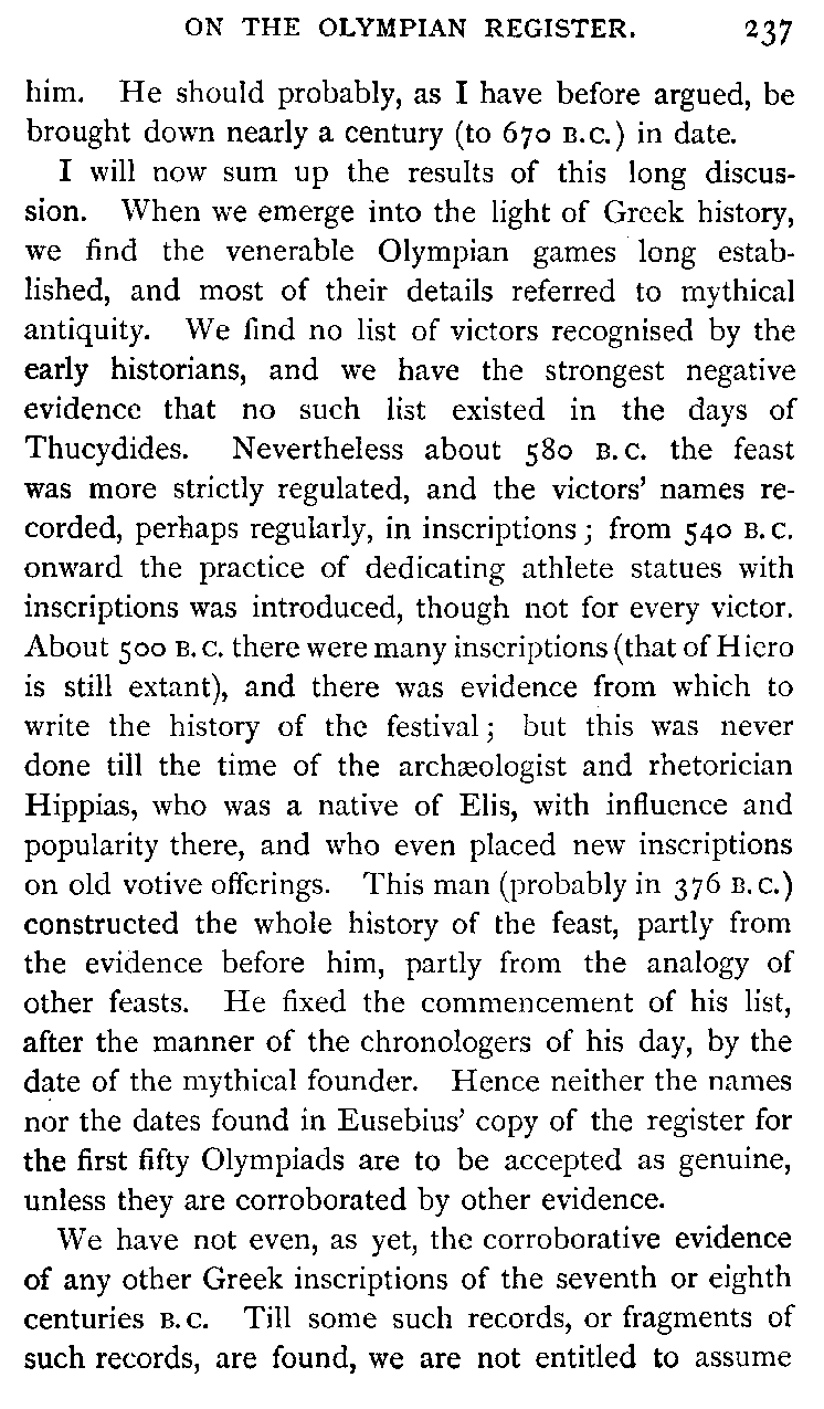 I will now sum up the results of this long discussion. When we emerge into the light of Greek history, we find the venerable Olympian games long established, and most of their details referred to mythical antiquity. We find no list of victors recognised by the early historians, and we have the strongest negative evidence that no such list existed in the days of Thucydides. Nevertheless about 580 B.C. the feast was more strictly regulated, and the victors' names recorded, perhaps regularly, in inscriptions; from 540 B.C. onward the practice of dedicating athlete statues with inscriptions was introduced, though not for every victor. About 500 B.C. there were many inscriptions (that of Hiero is still extant), and there was evidence from which to write the history of the festival; but this was never done till the time of the archæologist and rhetorician Hippias, who was a native of Elis, with influence and popularity there, and who even placed new inscriptions on old votive offerings. This man (probably in 376 B.C.) constructed the whole history of the feast, partly from the evidence before him, partly from the analogy of other feasts. He fixed the commencement of his list, after the manner of the chronologers of his day, by the date of the mythical founder. Hence neither the names nor the dates found in Eusebius' copy of the register for the first fifty Olympiads are to be accepted as genuine, unless they are corroborated by other evidence.