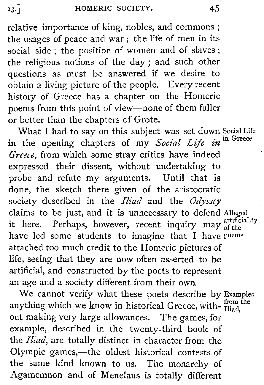 It does not therefore appear to me that the antiquity of the Homer which we possess is materially [xii]established by these newer researches. That the earliest lays embodied in the Iliad were very old has never been doubted by any sane critic, and has always been maintained by me on independent grounds. But I now think it likely that the great man who brought dramatic unity into the Iliad, and who may have lived near 800 B.C., did far more than merely string together, and make intelligible, older poems. He made the old life of Mycenæ into the newer Ionic life of Asia Minor. I am sorry to disagree with Mr. Leaf when he calls that Ionic society 'democratic to the core.' Any one who will read what even Pausanias records of its traditions will see that it was aristocratic to the core, and quite as likely to love heroic legends as any other Greek society of that day.