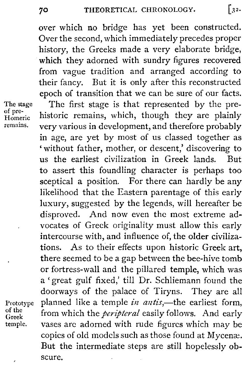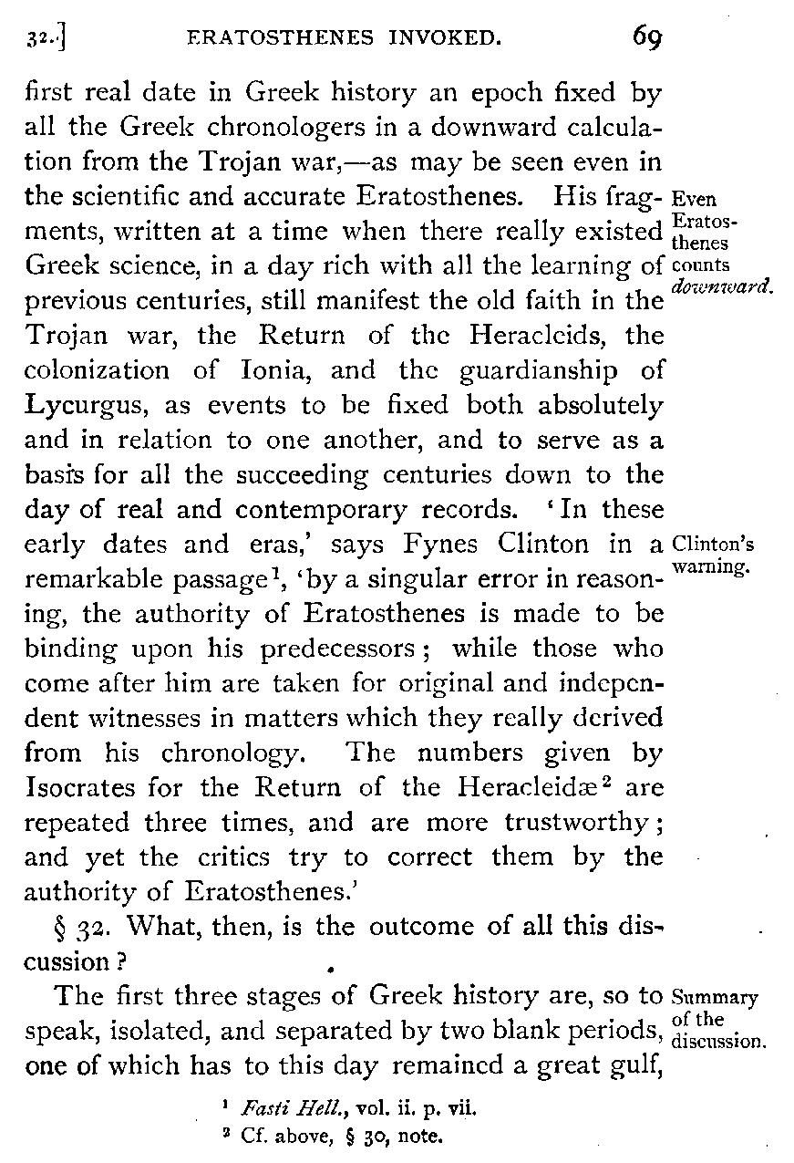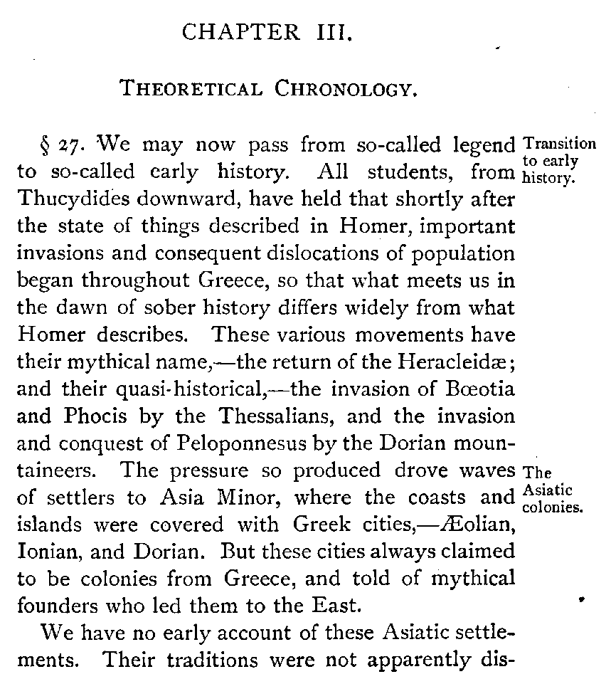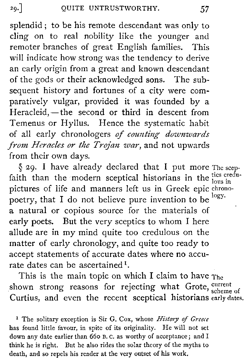 There seems a sort of general agreement among modern historians of Greece to accept the 1st Olympiad (776 B.C.) as the trustworthy starting-point of solid Greek chronology. Even Grote, so sceptical about legends, and so slow to gather inferences from them, accepts this date. There is only one exception, I think, to be found in Sir George Cox, who evidently rejects the Olympian register, who will not set down in his chronology any figure higher than 670 B.C., and even that under the protest of a query.