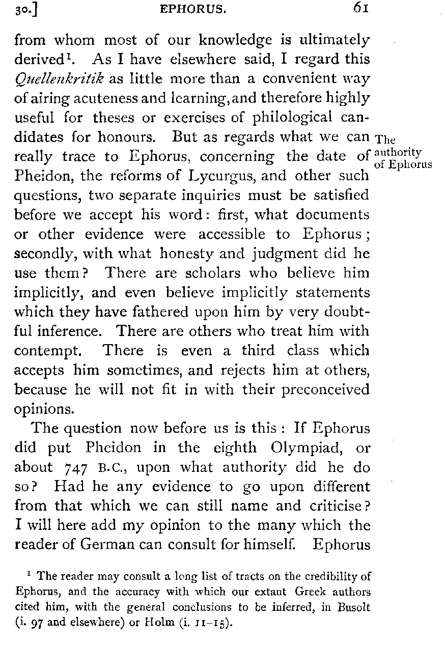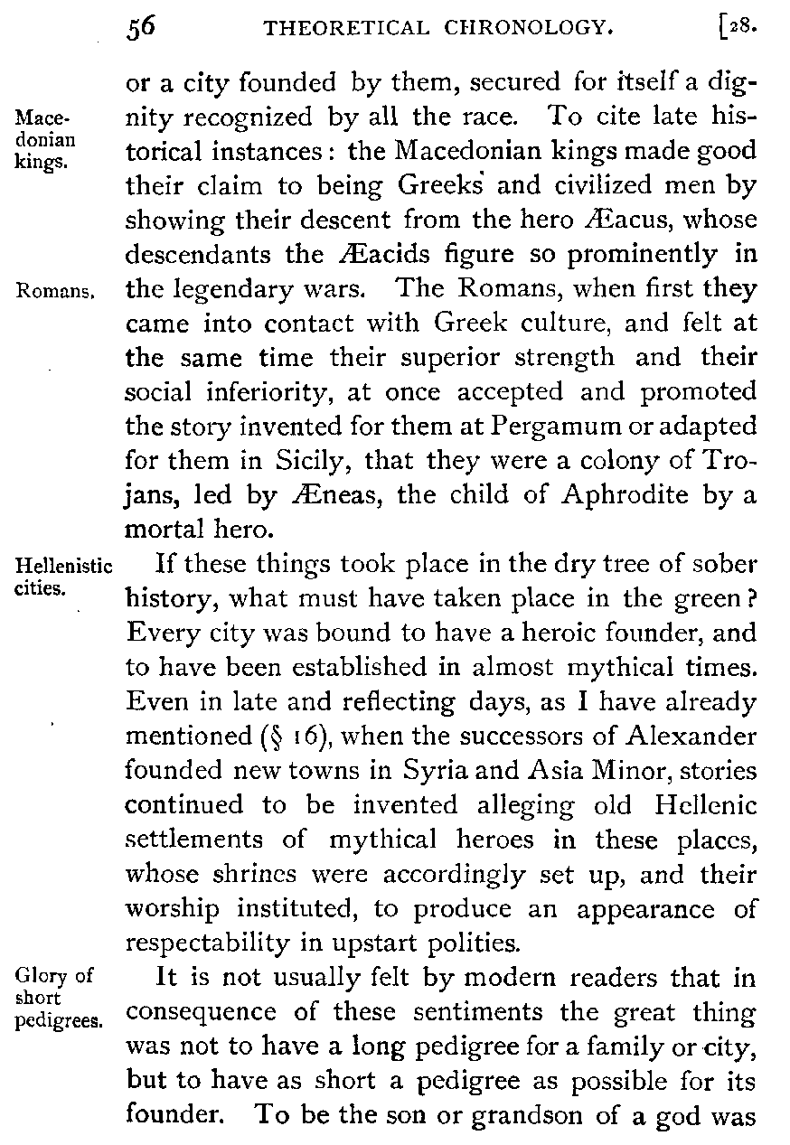 [236]Unfortunately the genealogy of Iphitus is not extant; in Pausanias' day he already had three different fathers assigned to him (v. 4, 6.); and we cannot, therefore, follow out the a priori scheme of Hippias in this instance; but I will illustrate it by another, which still plays a prominent figure in our histories of Greece—I mean the chronology of the Sicilian and Italian colonies, as given by Thucydides in his sixth book. He speaks with considerable precision of events in the latter half of the eighth century B.C.; he even speaks of an event which happened 300 years before the arrival of the Greeks in Sicily. As Thucydides was not inspired, he must have drawn these things from some authority; as he mentions no state documents it has been conjectured that his source was here the work of Antiochus of Syracuse. This man was evidently an antiquarian no wiser or more scientific than his fellows; Thucydides betrays their method by dating all the foundations downwards from that of Syracuse. Antiochus was obliged to admit the priority of Naxos, but grants it only one year; then he starts from his fixed era. But how was the date of the foundation of Syracuse determined? Not, so far as we know, from city registers and careful computations of years backward from the fifth century. Such an assumption is to my mind chimerical, and the source of many illusions. The foundation of Syracuse was determined as to date by its founder, Archias, being the tenth from Temenos. The return of the Herakleidæ was placed before the middle of the eleventh century B.C.; hence Archias would fall below the middle of the eighth century. The usual date of Pheidon of Argos, 747 B.C., was fixed in the same way by his being the tenth Temenid, and hence the 8th Ol. was set down as the an-Olympiad celebrated by [237]him. He should probably, as I have before argued, be brought down nearly a century (to 670 B.C.) in date.