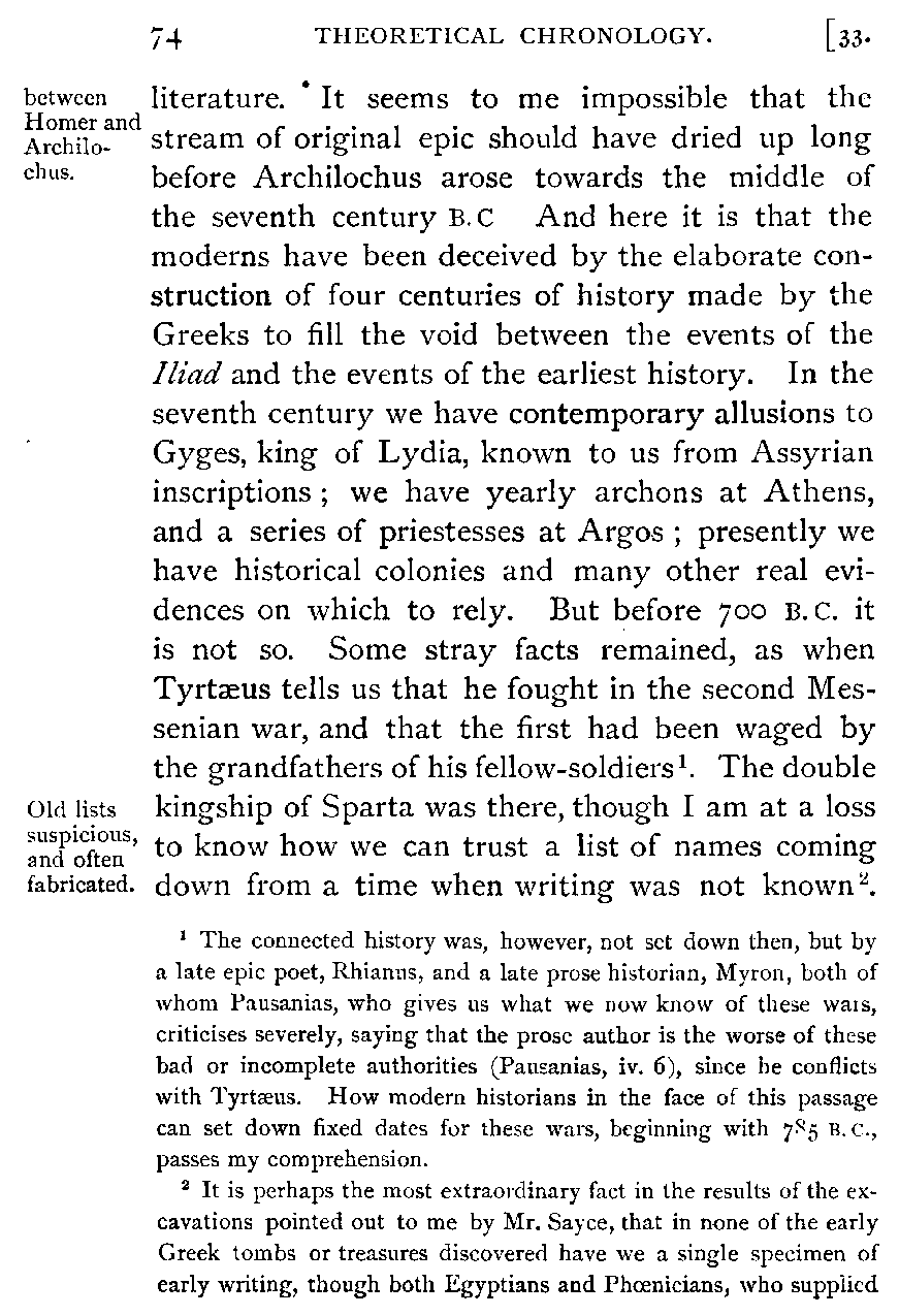We have not even, as yet, the corroborative evidence of any other Greek inscriptions of the seventh or eighth centuries B.C. Till some such records, or fragments of such records, are found, we are not entitled to assume [238]that the Greeks began to use writing upon stone for any records at such a date as 776 B.C. That great storehouse of old civilization, the Acropolis of Athens, has yielded us nothing of the kind; and even if we admit that the annual archons were noted down since 683 B.C. (which is far from certain), is not the further step to nearly a century earlier completely unwarrantable?