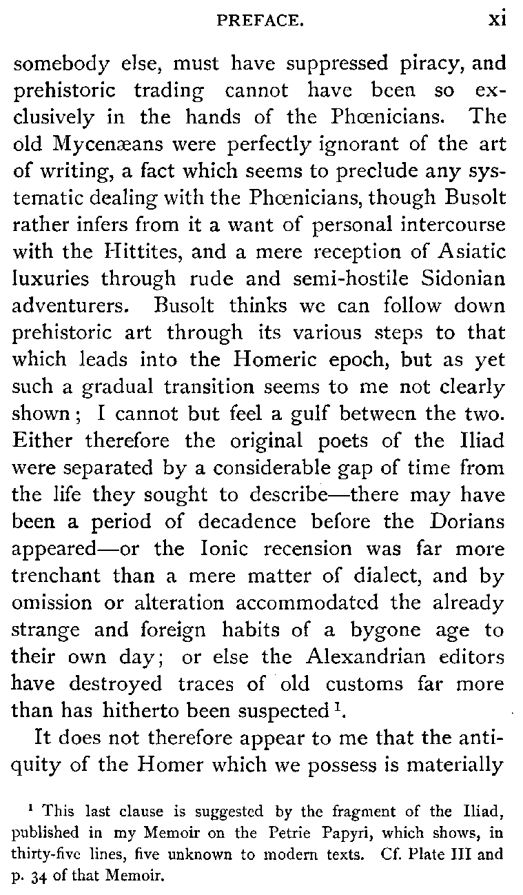 So far the case for the early date and historic basis of Homer seems considerably strengthened by recent research. Nevertheless, the marked contrasts between the Mycenæan Greeks and the society in Homer create a great difficulty. Some of these have been removed by the aid of (perhaps legitimate) ingenuity, but differences of dress, of burial customs, in the use of iron, &c., remain. The seafaring too of the Homeric Greeks does not seem to me at all what we may infer the Mycenæan seafaring to have been. Minos, or [xi]somebody else, must have suppressed piracy, and prehistoric trading cannot have been so exclusively in the hands of the Phœnicians. The Old Mycenæans were perfectly ignorant of the art of writing, a fact which seems to preclude any systematic dealing with the Phœnicians, though Busolt rather infers from it a want of personal intercourse with the Hittites, and a mere reception of Asiatic luxuries through rude and semi-hostile Sidonian adventurers. Busolt thinks we can follow down prehistoric art through its various steps to that which leads into the Homeric epoch, but as yet such a gradual transition seems to me not clearly shown; I cannot but feel a gulf between the two. Either therefore the original poets of the Iliad were separated by a considerable gap of time from the life they sought to describe—there may have been a period of decadence before the Dorians appeared—or the Ionic recension was far more trenchant than a mere matter of dialect, and by omission or alteration accommodated the already strange and foreign habits of a bygone age to their own day; or else the Alexandrian editors have destroyed traces of old customs far more than has hitherto been suspected[xi:1].