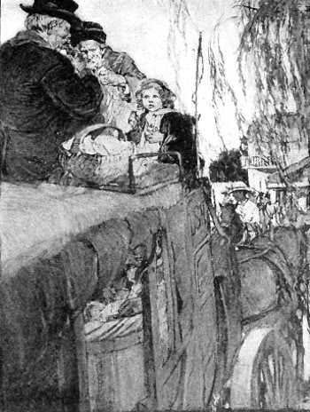 It turned out that she was to go to her Uncle Jonas, and that Mr. Sanders had come after her; and then, my goodness gracious! she was so full of anticipation and joy that she was frightened for herself. The kind ladies who had had charge of her told her not to be frightened, and to be very good, but she just rolled her big blue eyes, and had long, long thoughts about things of which she never breathed a word. She started at last, and went with Mr. Sanders on the choo-choo train, and such a time as the two had buying tickets to Malvern, and laughing at the people they saw, and getting their baggage checked, and getting on the train, and watching the station slide back away from them so they could get a good start—such a time has hardly been repeated for anybody from that day to this.