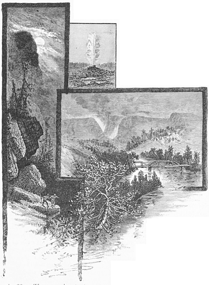 It may be doubted whether the world affords another tour at once so delightful and so instructive as that which, beginning at the head of the Mississippi valley, and crossing the great wheat fields of Dakota and Eastern Washington, the stock ranges of Montana, and the gold and silver ribbed mountains of Montana and Idaho, embraces also the wonders of the Yellowstone National Park, and the incomparable scenery of the Columbia river, to crown all with the stupendous sights of that Great Land whose unique natural features have earned for it the well-deserved title of “Wonderland.” No longer one of peril and hardship, but, on the contrary, one of absolute luxury, this tour has, within the last two years, attracted thousands of pilgrims from all parts of the civilized world. To them, as well as to all other lovers of the sublime and beautiful, and to the students of the mysteries of Nature in all lands, who may have the good fortune to visit the far Northwest in 1886, the following pages are respectfully inscribed.