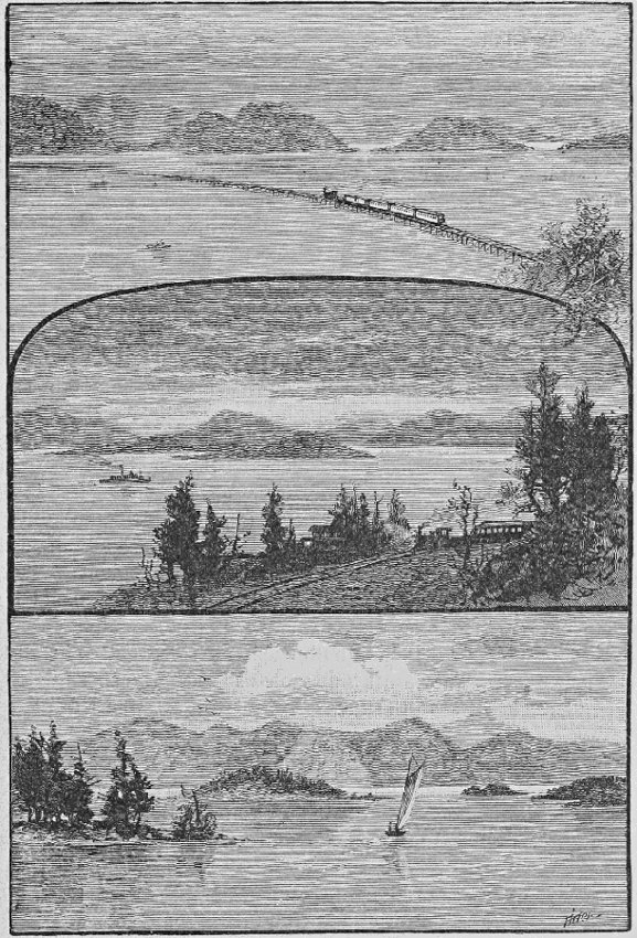 “The difficult thing for the tourist to do in regard to Alaska is to describe what is seen for the general reader. Everything is on such an immense and massive scale that words are diminutives for expression, rather than—as travelers have been credited with using them—for exaggerated descriptions. For example, people cross the continent to sail for an hour or two among the Thousand Islands of the St. Lawrence, and word-painting has been exhausted in exaltation of their beauties. But here is a thousand miles of islands, ranging in size from an acre to the proportions of a State, covered with evergreen forests of tropical luxuriance, yet so arctic in their character as to be new to the eye, and in regard to which botanical nomenclature but confuses and dissatisfies. And in all this vast extent of mountain scenery, with summits ranging from one thousand to fifteen thousand feet in height, there is not enough level land visible to aggregate one prairie county in Western Missouri or Kansas. Day after day there is a continuous and unbroken chain of mountain scenery. I can not better impress the character of the landscape, as seen from a vessel's deck, than to ask the reader to imagine the parks, valleys, cañons, gorges and depressions of the Rocky Mountains to be filled with water to the base of the snowy range, and then take a sail through them from Santa Fé to the northern line of Montana. Just about what could be seen on such an imaginary voyage is actually passed through in the sail now completed by our party of enthusiastic tourists for the past ten days. You may divide the scenery into parts by the days, and just as it was successively passed through, and any one of the subdivisions will furnish more grand[Pg 96] combination of mountain and sea than can be seen anywhere on the globe. It is this vast profusion of scenery, this daily and hourly unrolling of the panorama, that overwhelms and confuses the observer. It is too great to be separated into details, and everything is platted on such a gigantic scale that all former experiences are dwarfed, and the imagination rejects the adjectives that have heretofore served for other scenes: to employ them here is only to mislead.”