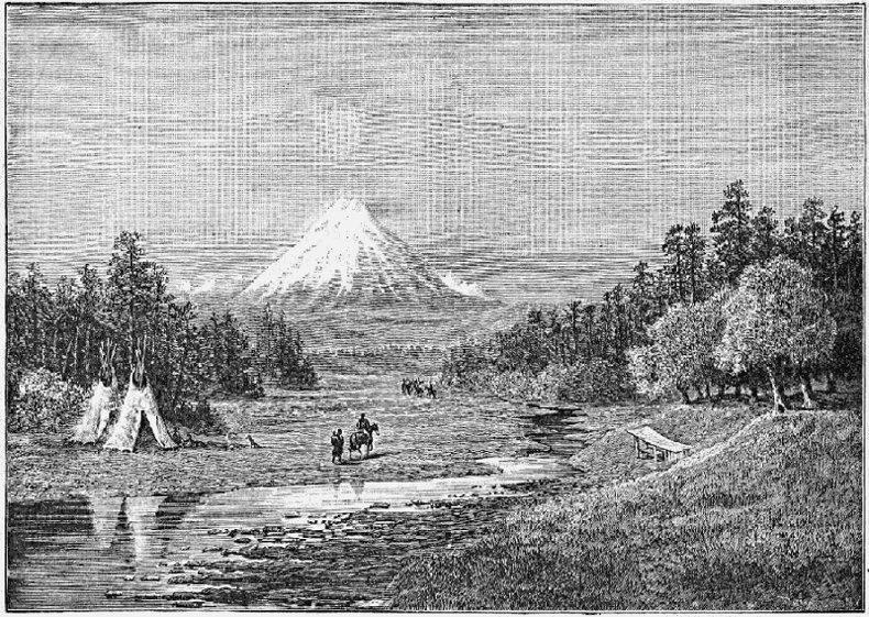 Almost directly west from Sitka, about fifteen miles distant, is Mount[Pg 76] Edgecumbe, so named by Cook, it having previously been called Mount San Jacinto by Bodega in 1775, and Mount St. Hyacinth again by La Perouse. Tchirikov, before all others, I believe, got it chronicled as Mount St. Lazarus; and it looked as if it would go through the whole calendar of the saints, and their different national changes, if it had not gotten pretty firmly rooted as Mount Edgecumbe. It is nearly 3,000 feet above the level of the sea, and looks like a peak of 5,000 feet cut off by a huge shaving plane at its present height. This truncated apex is a crater, said to be, by those who have visited it, some 2,000 feet in diameter by one-tenth as deep. In the early and middle summer time, the snow from its table-like crown has partially disappeared, and the bright red volcanic rock projects in radiating ridges from the white covering that is disappearing, making a most beautiful crest to a mountain already picturesque by its singular isolation. When in this condition, with the western setting sun directly over it, and its golden beams radiating upward, and the royal red ridges radiating downward, both thrown against their background of blue sky and water and white snow, it makes a superb picture that the brush of a Turner could hardly copy, let alone a feeble pen describe.