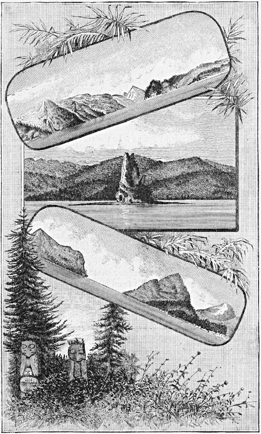 But let us leave this piscatorial paradise, as painted by one who is an artist in his line, and wend our way through the forty miles of Fitzhugh Sound. Then comes Lama Passage, contracted, winding and picturesque, about fourteen or fifteen miles long. About half way through we pass very near the Indian village of Bella-Bella, and which is also a Hudson[Pg 63] Bay Company trading post. The Bella-Bellas were once a large tribe living in these parts; but the little village, of about twenty Indian houses, that the tourist passes on his left, represents the greater portion of the tribe at present, and gives one a practical and forcible illustration of the disappearance of “the noble red man.” A mission residence and a church, with the cattle on the cleared hills, give the place quite a civilized aspect. After Lama Passage comes Seaforth Channel, just as winding and pretty; the swingings to the right and left, in places where the passage is apparently right ahead, increase your respect for the pilot, and you wonder, in all these intricacies, like Goldsmith's village schoolmaster, “how one small head could carry all he knew.” At Milbank Sound we look out to sea for a brief half-hour, and then plunge into Finlayson Channel, a typical waterway of the inland passage, like a great river. The sides are very high mountains, densely timbered nearly to the top, where snow exists the year round, forming a base of supplies for the beautiful waterfalls that dash down the precipitous heights, like silvery columns, on a deep green background. It is said that all the little streams of this region swarm with salmon, giving the Indians a most bountiful supply. Then comes Graham Reach, about twenty miles long; then Fraser Reach, of ten miles; and McKay Reach, of seven,—that could all have been given a single name, and much trouble have been saved. A little, irregular sheet of water, called Wright Sound, and Grenville Channel, “as straight as an arrow,” gives us nearly fifty miles of rectilinear sailing.