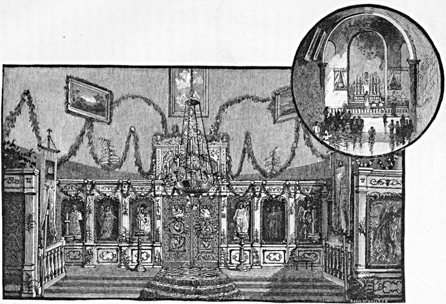 In the town proper the Greek Church is the most conspicuous and interesting object to the tourist, and especially those who have never seen one of this religion. It is built in the form of a Greek cross, in plan, and is surmounted by an Oriental dome over the centre, which has been painted an emerald green color. One wing is used as a chapel, and contains, besides a curious font, an exquisite painting of the Virgin and Child, copied from the celebrated picture at Moscow. All the drapery is of silver, and the halo of gold; so, of the painting itself, nothing is seen but the faces and background. The chancel, which is raised above the body of the church, is approached by three broad steps leading to four doors, two of which are handsomely carved and richly gilded, and contain four oval and two square bas reliefs. Above is a large picture of the Last Supper, covered, like that of the Madonna, with silver, as are two others, one on each side of the altar. Across the threshold of these doors no woman may set her foot, and across the inner ones to the[Pg 74] innermost sanctuary none but the priest himself, or his superiors in the general Greek Church, or the white Czar, can enter. The doors, however, usually stand open; and the priest in residence, Father Metropaulski, is exceedingly courteous to visitors, showing them the costly and magnificent vestments and the bishop's crown, almost covered with pearls and amethysts. The ornaments and the candelabra are all of silver, the walls are hung with portraits of princes and prelates, and the general effect is rich in the extreme.