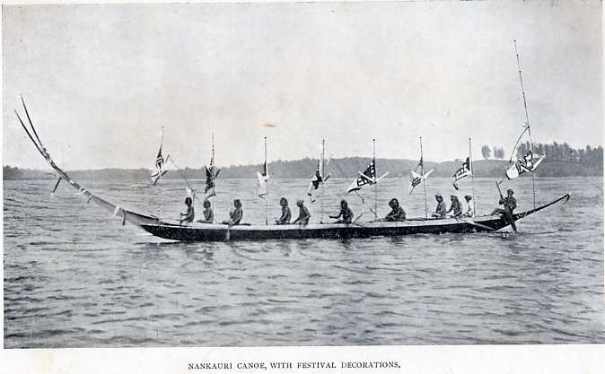 [214] This monoply is due to their geographical position. The Kar Nicobarese find it as much as they dare venture to do, to go so far as Chaura for their large canoes and pots. As it is, many lives are lost at sea. (In 1899 at least 29 were drowned in returning from this island, and more recently 12 or 13 were similarly lost.) Chaura is situated midway between Kar Nicobar and Nankauri Harbour and Kamorta, where the principal purchases are made by the Chaura people.