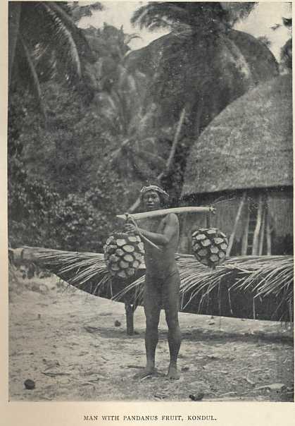 [177] In many islands of the Pacific Ocean—Marshalls, Gilbert and Kingsmills, the Carolines, Union, and Ellice, and in New Guinea—the pandanus fruit is used as a food, especially in times of scarcity, but in general the kernel only is eaten, and the inner end of the drupes gnawed off.