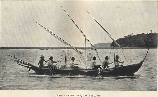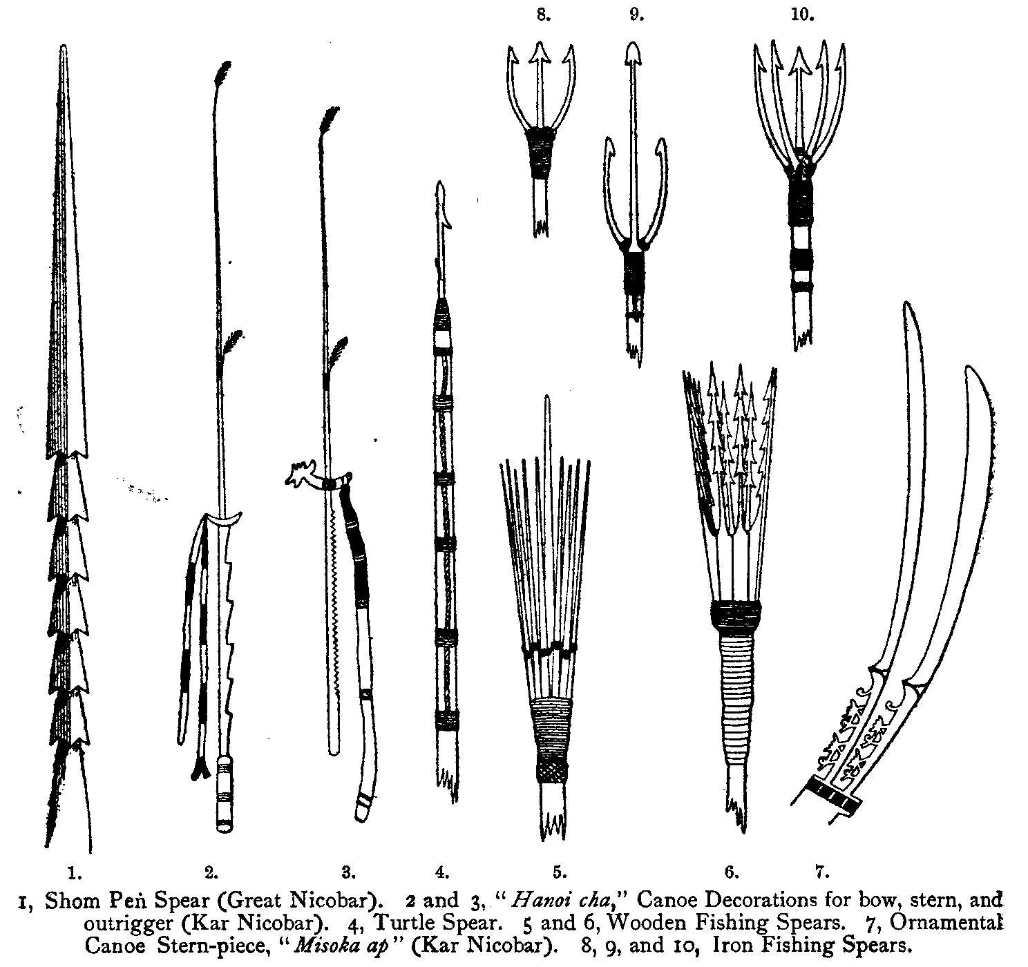 [215] "I was present on a certain occasion at Mūs ... having brought Tanamara with me from Nankauri. In strolling through the village we caught sight of a fine large canoe, which he recognised as having been sold by him to a certain native of Chaura. Offandi proved to be the owner, and he, on being questioned, said that he had bought it from the same man. On further enquiry it was found, that while the Chaura middleman had promised to give 25 rupees in kind to Tanamara (only part of which had yet been paid), he would not let Offandi have it till he had delivered to him a long list of articles (e.g. cloth, spoons, tobacco, etc.), which, on being totalled up, were found to amount to about 105 rupees in value."—E. H. Man.