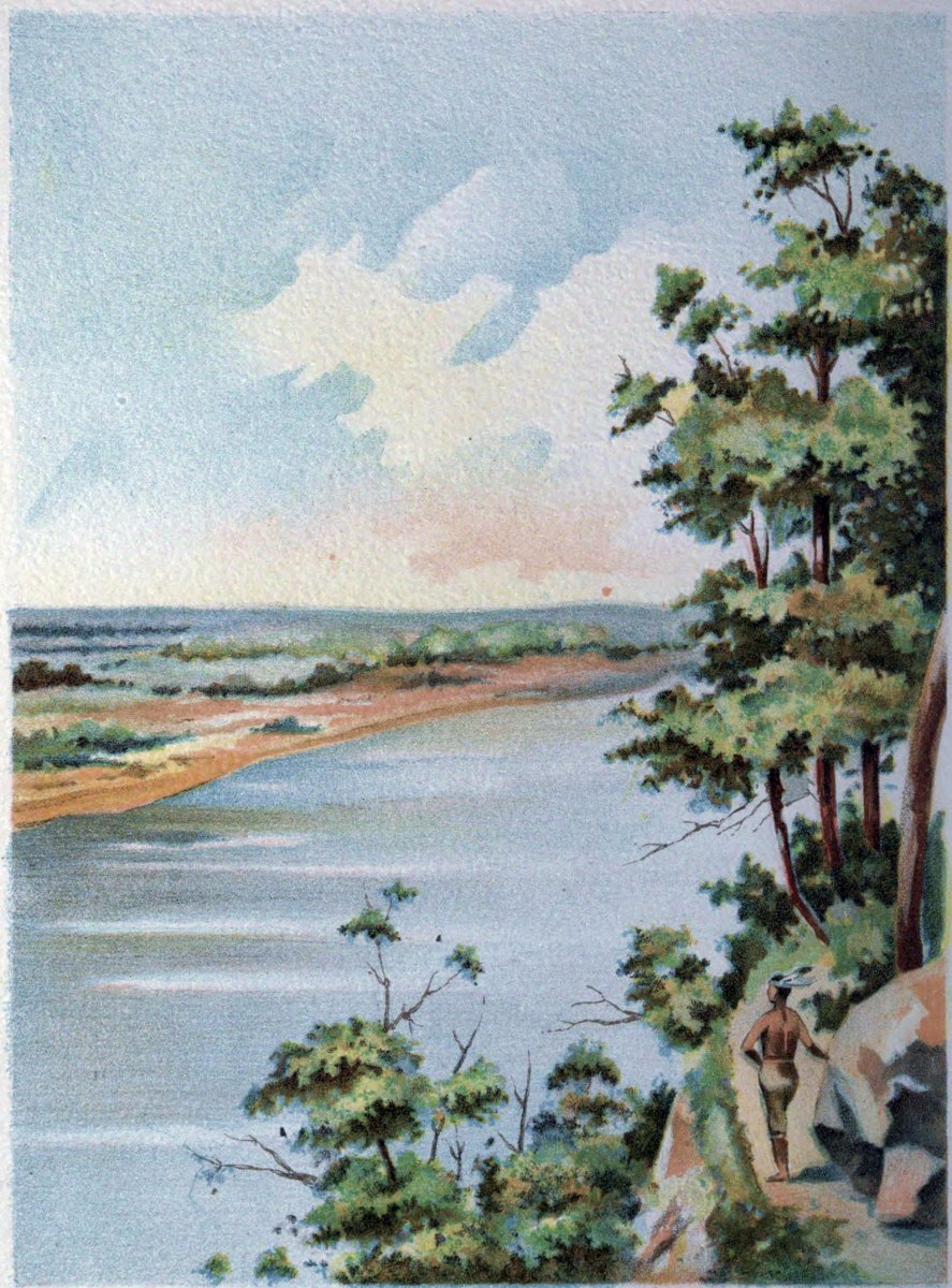 Maune´, suspecting these designs, crept quietly behind the partition that screened the officers from view, and listened to the development of the plan. Her affectionate heart sank as she became aware of her husband's perfidy. Love, grief and determination followed in rapid succession. Sadly she stole away and prepared for flight. A canoe was stored with provisions and the sleeping children placed inside; then, with mingled feelings of affection and the hatred and resolution peculiar to her race, she bade farewell to home, happiness, country, all that made life dear, except the slumbering babes. For[Pg 187] their sakes she would struggle through the wilderness to a more favored land. Where, she knew not. The Great Spirit would guide and protect her; and the blood of fierce warriors, which flowed in the veins of this child of Nature, gave strength and courage in the hour of need.