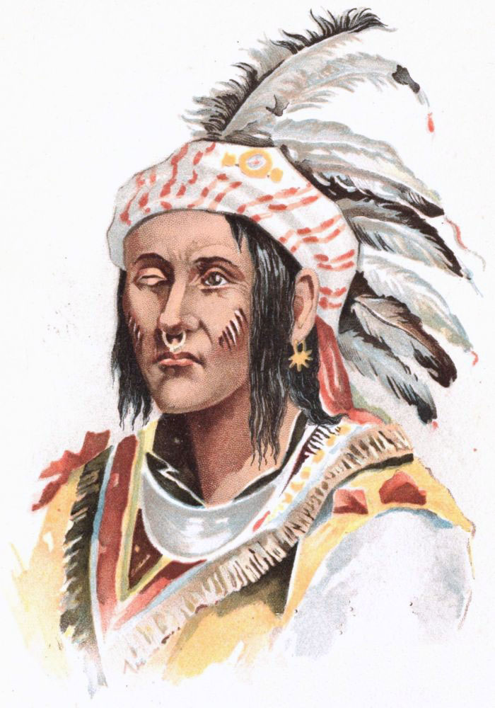 Elkswatawa entered, clad in garments made from the skins of wild animals. In addition to these, a kind of turban surmounted with bunches of feathers, a nose ring, large earrings, hideously painted cheeks, and a sightless eye, the other gleaming with malignant fire, were well calculated to inspire terror. The man was an object of superstitious awe to the Northwestern Indians.[Pg 195]
