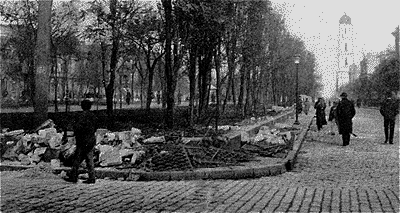D'un aspect plus mouvementé encore sont les photographies d'Odessa reproduites ici. Notre correspondant a pris ces instantanés au milieu même de l'émeute sanglante dont le télégraphe nous a apporté les échos. On constate, en les regardant, combien une grande ville en pleine révolution a un aspect différent de celui qu'on serait tenté de supposer. Entre les bagarres, les collisions sanglantes, les heures de pillage et de tuerie, la vie poursuit quand même son cours. Dès qu'on ne se bat plus autour d'une barricade, des gens paisibles, des femmes, s'en approchent sans trop d'effroi. Autour d'un révolutionnaire blessé, que l'on conduit de l'ambulance à l'hôpital, des galopins courent insouciants. Pourtant la page ci-contre est sinistre. Le correspondant de l' Illustration, qui a pris cette photographie, avait assisté, le 2 novembre, au meurtre à coups de crosse d'un étudiant par des soldats, sur un trottoir devant une boutique de tabac (close comme tous les magasins ce jour-là), et en face d'un poste de police. L'émotion le troubla et il manqua le cliché qui eût fixé cette scène de sauvagerie. Mais, un instant après, resté seul en présence du cadavre, avant d'aller chercher une voiture pour le faire enlever, il fit la photographie que nous publions et qui est si simplement tragique: un corps étendu, du sang sur les pavés, un passant qui regarde... sans s'approcher.