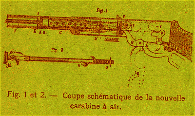Nous devons ajouter qu'elle peut projeter également des flèches; il suffit pour cela de dévisser la pièce représentée par la figure 2, d'introduire la flèche dans le tube, de revisser, armer et tirer. Toutefois, cette opération n'étant pas très rapide, il est préférable de se servir uniquement des plombs. On trouve cette carabine au prix de 15 francs franco, avec un sac de munitions, chez M. Murrison, représentant, 76, rue de Bondy, Paris.