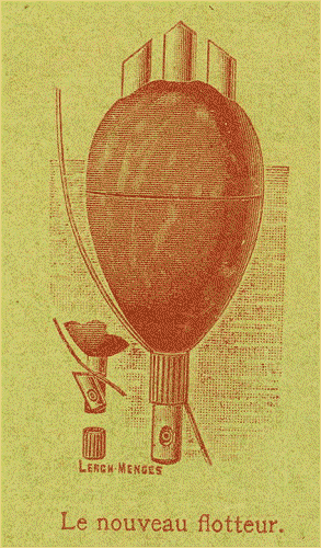 Lancé au large il se met automatiquement à l'eau dans la position verticale et y reste jusqu'à la bichée du poisson. Sur celle-ci il plonge et s'équilibre par l'eau qu'il prend: il est comme s'il n'était pas, pourrait-on dire. Le poisson, dont l'instinct de conservation n'est pas averti par la traction de bas en liant qu'exercent habituellement sur ses lèvres les flotteurs ordinaires, ne rejette pas l'esche: il l'avale et se prend de lui-même.