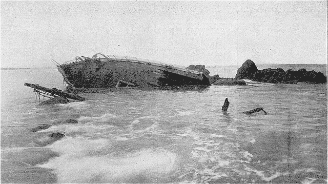 Le lendemain, on put se rendre compte de la position de l'épave, brisée net par le ressac en deux endroits.