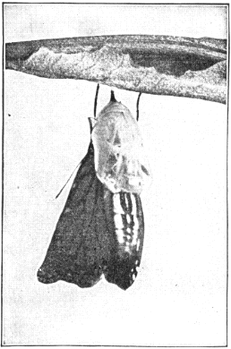 A week or ten days after the last moult of its caterpillar growth the larva commonly becomes full fed and ready to change to the chrysalis state. The details of the way in which this is accomplished vary greatly with different butterflies, as will be noted in the stories of many species later in this book. In general, however, the caterpillar provides a web of silk which it spins against some surface where the chrysalis will be secure and in this web it entangles its hind legs. Sometimes there is the additional protection of a loop of silk over the front end of the body. After the legs have become entangled the caterpillar hangs downward until the skin splits open along the median line of the back and gradually shrinks upward until it is almost free, showing as it comes off a curious creature which has some of the characteristic features of a chrysalis. It is seldom at this stage of the same shape as the chrysalis. When the caterpillar's skin is nearly off this chrysalis-like object usually wriggles its body quickly in a manner to entangle a curious set of hooks attached to the upper end in the web of silken thread. This hook-like projection is called the cremaster, and it serves a very important purpose in holding the chrysalis in position.