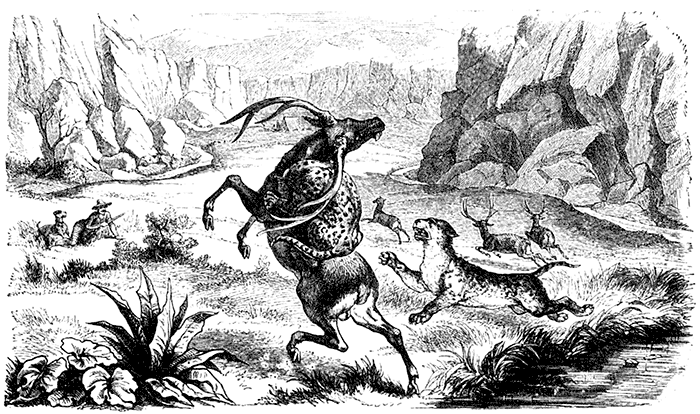 I had gone some distance without getting within shot, though I frequently saw game, and the low position of the sun warned me to commence my return to camp, I was following a small affluent of the stream, which came down from the hills a little more to the south, in order not to return by the same road I had come, when I suddenly heard about half a mile off a roar that exactly resembled that of a lion. I ran in the direction whence the sound came, and soon saw on the bank of the stream two giant stags engaged in a most furious contest and surrounded by a herd of does, and further on some large stags on the watch, I ran up within forty yards of them unnoticed, while with their huge antlers intertwined they butted each other, and frequently sank on their knees. I shot the largest, which fell, and its enemy at once buried its tines in the flanks of its overpowered foe, not suspecting that the same rifle which had slain its opponent still held a deadly bullet in readiness. I could easily have killed it, but preferred a fawn, which was standing no great distance off, and killed it. I now got up behind the rocks to reload, and the startled herd darted off to the mountains. I went up to the stag, which had two-and-twenty tines, and was very plump; after which I hurried to reach camp before it grew dark, and met Owl, who had shot nothing. As we had nothing left to eat, we at once started with Jack to fetch in the game, taking some firebrands of pine-wood as torches. The night was dark, but the torchlight illumined all the objects around the more distinctly in consequence. Antonio walked in front, I followed with Trusty, and Königstein, with Jack, formed the rear. We soon reached the stags, and loaded Jack with a large supply of meat, with which we arrived in camp about ten o'clock. Our hunger was great, as we had eaten nothing since morning, and we sat till a late hour round the fire turning our spits. Tiger was much better; the pain was reduced, and the swelling of the wounds was slight. The next morning, however, as the bandages had not been wetted during his sleep, his arm was very stiff, while the pain was greater, and hence I resolved to stop where we were at least for the day.