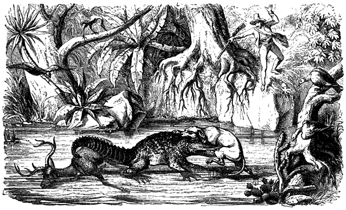 I accidentally looked again toward the sparkling water and noticed a trunk of a tree in the middle of it, which I had not seen a few moments previously. What could have raised it from the bottom of the pond to the surface? I sat up a little and saw a second and a third emerge by its side: I did not stir, but continued to gaze, and in ten minutes the pools were covered with old wood. I cried in a low voice to Tiger to look, but he had scarce done so ere he laughed, and said they were alligators enjoying the sunshine. The surface of both pools was literally covered with these monsters, mostly of a large size. I cried to my comrades to take their rifles, quietly aim at their heads, and fire when I gave the signal. I did so; our guns exploded simultaneously, and the water spirted up furiously, and bedewed the grass for a long way round. Only two of the monsters remained in sight, shooting backwards and forwards in the water, and beating their tails so furiously that the spray dashed over us. At this moment Antonio came up with a lasso, and in an instant threw the noose over one of the furious creatures. We all ran with the end of the rope over the grass, and dragged the alligator on land, when it snapped savagely around with its fearful jaws, and lashed its tail. We now set to work with pistols, and ere long its head had so many holes in it that it could not move its dangerous jaws. Its comrade was still swimming quietly on the top of the water, so we fetched it out too on to the grass, when it behaved as furiously as the first, but we soon put an end to its fun. They were two gigantic animals, nearly sixteen feet long, and their throats were armed with rows of terrible teeth, some of which we all took as a memento.