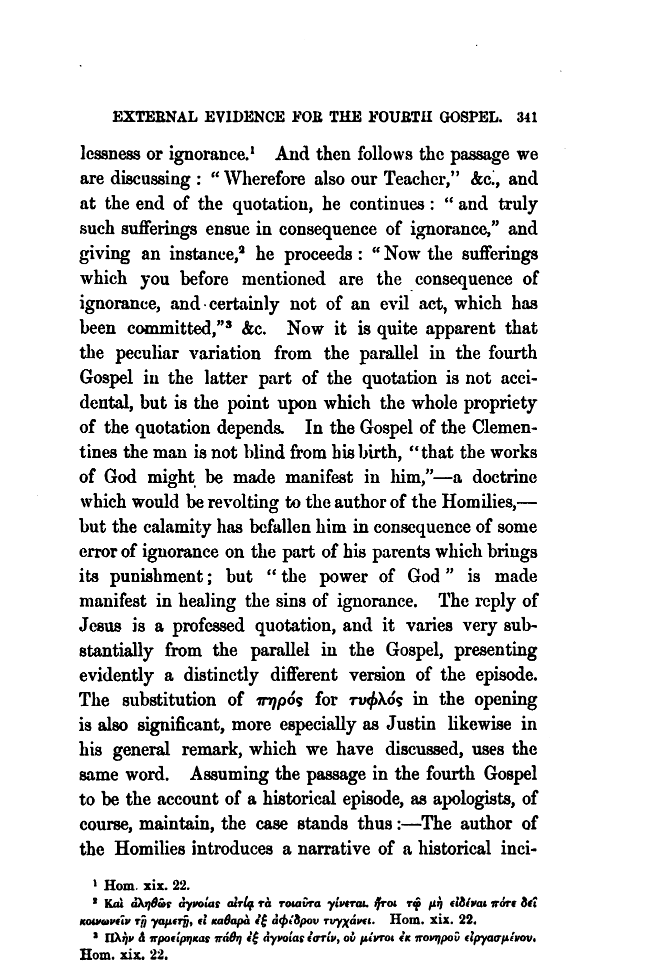 As we have already discussed this passage(1) we need not repeat our remarks here. That this passage comes from a source different from our Gospels is rendered still more probable by the quotation in Hom. xix. 2 being preceded by another which has no parallel at all in our Gospels. "And elsewhere he said, 'He who sowed the bad seed is the devil' [———](2): and again: 'Give no pretext to the evil one.'(2) [———]. But in exhorting he prescribes: 'Let your yea be yea.'" &c. The first of these phrases differs markedly from our Gospels; the second is not in them at all; the third, which we are considering, differs likewise in an important degree in common with Justin's quotation, and there is every reason for supposing that the whole were derived from the same unknown source.(3) In the same Homily, xix. 2, there occurs also the passage which exhibits variations likewise found in Justin, which we have already examined,(4) and now