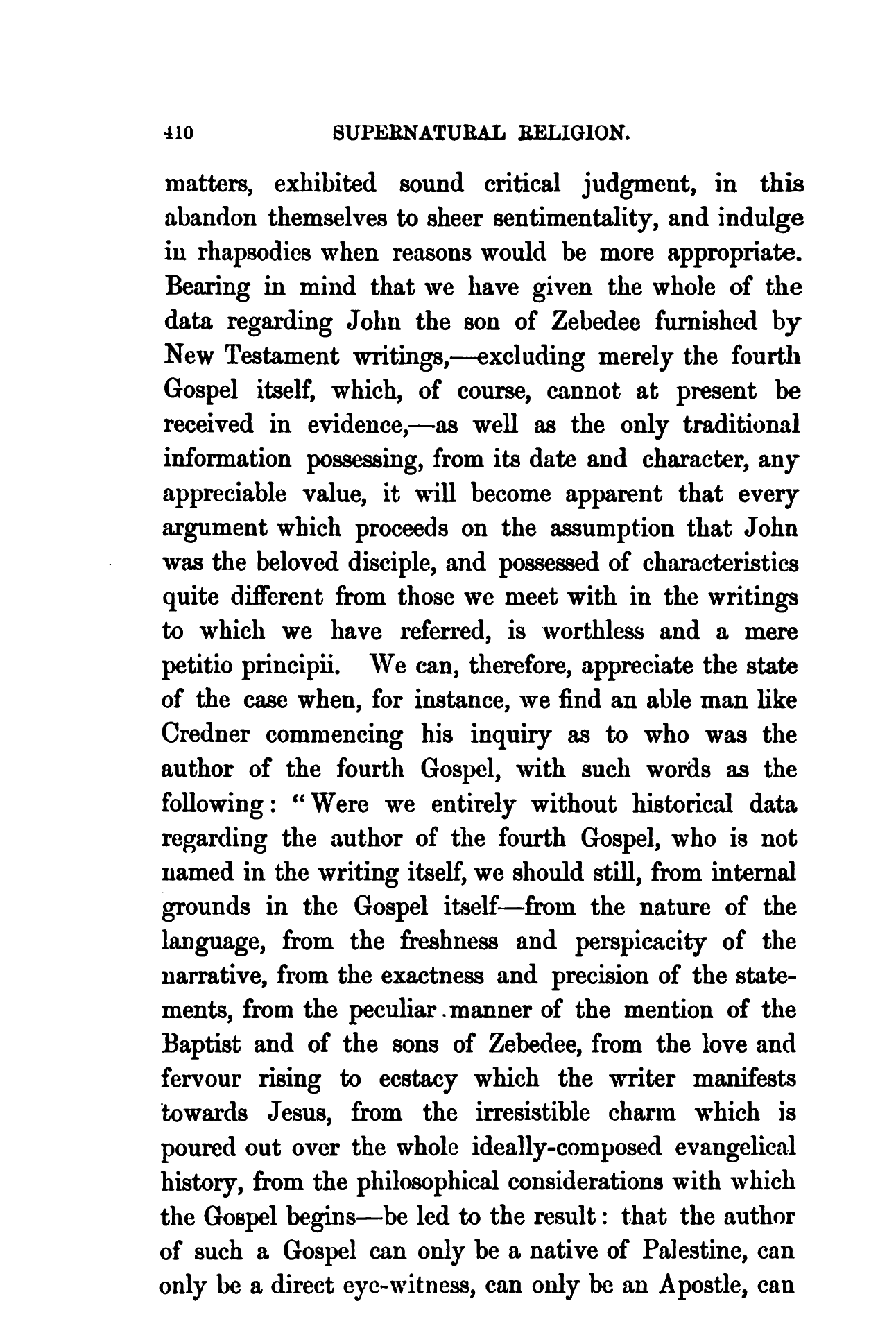 We have seen that, whilst there is not one particle of evidence during a century and a half after the events recorded in the fourth Gospel that it was composed by the son of Zebedee, there is, on the contrary, the strongest reason for believing that he did not write it. The first writer who quotes a passage of the Gospel with the mention of his name is Theophilus of Antioch, who gives the few words: "In the beginning was the Word and the Word was with God," as spoken by "John," whom he considers amongst the divinely inspired [———]