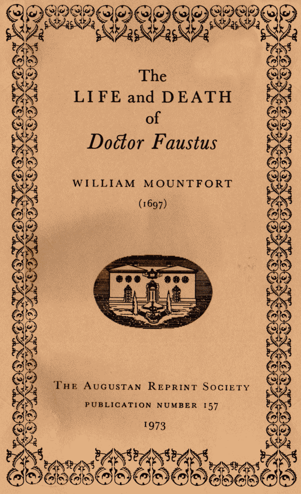 Mountfort took as his raw material Marlowe's great tragedy and for that reason "Dr. Faustus" may be to some extent thought of as a burlesque. The Restoration audience delighted in Marlowe's Faustus; the Elizabethan tragedy had been played in 1662, and there was a performance at the Duke's Theater in September, 1675. Edward Phillips wrote in his Theatrum Poetarum, that "of all that [Marlowe] hath written to the Stage his Dr. Faustus hath made the greatest noise with its Devils and such like Tragical sport."[10] Here lies the suggestion that Mountfort was to take up, for as Borgman notes, Marlowe's tragedy has two distinct lines: the mighty verse which makes up the tragedy of an heroic overreacher, and a comic line of farcical lazzi. Mountfort has trimmed away the poetry of Marlowe and, for the most part, retained the farcical elements of the earlier play.[11][ix]