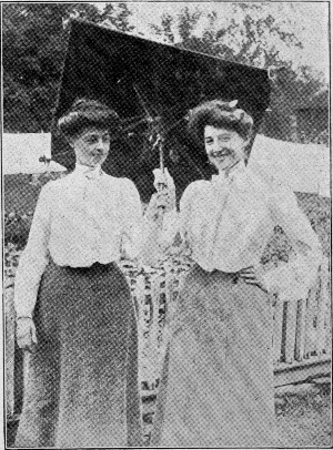 "I send you a photograph showing a unique umbrella which sheltered two young ladies under it during a violent thunderstorm. While spending my holiday in the Blue Mountains of Sullivan County, New York, I decided to take a trip to Minisink Battlefield, in the town of Highland, where, on July 22nd, 1779, a tribe of Indians, led by the noted half-breed, Joseph Brant, massacred a band of white soldiers, who had made an heroic fight and had gained the upper hand, when they discovered that their ammunition had given out. A rude monument of stone marks the spot, and while I was taking a photograph of it the storm broke. Our party found temporary shelter in an abandoned hut in a quarry at the mountain top, but being miles from our stopping-place, and having failed to provide ourselves with even a single umbrella, one of the party, Mr. Ralph Austin, saw possibilities in the umbrella line when I folded up my rubber-coated focusing cloth. A birch sapling furnished the rod, and branches of maple trees were made to serve as ribs. These were held in place by strips torn from a handkerchief. Then the focusing cloth was stretched across the frame and tied down at the corners with more strips from the handkerchief. The homeward journey was then begun, and for a distance of nearly four miles the young ladies walked under the umbrella, which thoroughly protected them from the rain. They were so pleased with this ingenious umbrella that they insisted upon being photographed under it."—Mr. Adolph A. Langer, 116, Danforth Avenue, Jersey City, N.J.
