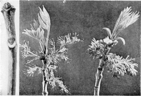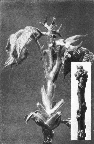 Sometimes these bud scales lengthen before the shoot spares them. The silky, brown scales of the beech buds sometimes add twice their length, thus protecting the lengthening shoot which seems more delicate than most kinds, less ready to encounter unguarded the wind and the sun. The hickories, shagbark, and mockernut, show scales more than three inches long.