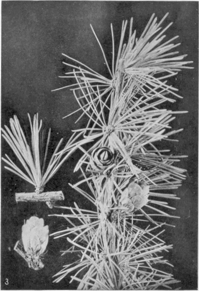 The tamarack or American larch (see illustration, page 263) goes farther north than any other tree, except dwarf willows and birches. Above these stunted, broad-leaved trees pure forests of tamarack rise, covering Northern swamps from Newfoundland and Labrador to Hudson Bay and west across the Rocky Mountains, the trees dwindling in size as they approach the arctic tundras, the limit of tree growth. The wood of these bravest of all conifers is a God-send over vast territories where other supply of timber is wanting. The tough roots of the larch tree supply threads with which the Indian sews his birch canoe.
