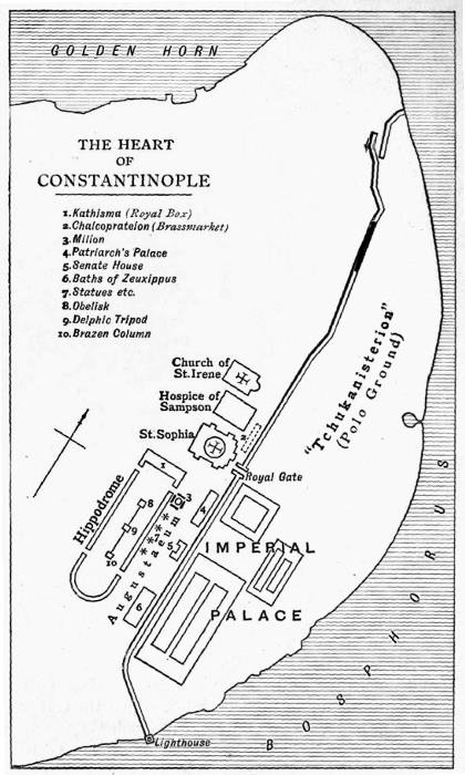 All along the western side of the Augustaeum, facing the three buildings which we have already described, lay an edifice which played a very prominent part in the public life of Constantinople. This was the great Hippodrome, a splendid circus 640 cubits long and 160 broad, in which were renewed the games that Old Rome had known so well. The whole system the chariot-races between the teams that represented the “factions” of the Circus was reproduced at Byzantium with an energy that even surpassed the devotion of the Romans to horse racing. From the first foundation of the city the rivalry of the “Blues” and the “Greens” was one of the most striking features of the life of the place. It was carried far beyond the circus, and spread into all branches of life. We often hear of the “Green” faction identifying itself with Arianism, or of the “Blue” supporting a pretender to the throne. Not merely men of sporting interests, but persons of all ranks and professions, chose their colour and backed their faction. The system was a positive danger to the public peace, and constantly led to riots, culminating [pg 024] in the great sedition of a.d. 523, which we shall presently have to describe at length. In the Hippodrome the “Greens” always entered by the north-eastern gate, and sat on the east side; the “Blues” approached by the north-western gate and stretched along the western side. The emperor's box, called the Kathisma, occupied the whole of the short northern side, and contained many hundreds of seats for the imperial retinue. The great central throne of the Kathisma was the place in which the monarch showed himself most frequently to his subjects, and around it many strange scenes were enacted. It was on this throne that the rebel Hypatius was crowned emperor by the mob, with his own wife's necklace for an impromptu diadem. Here also, two centuries later, the Emperor Justinian II. sat in state after his reconquest of Constantinople, with his rivals, Leontius and Apsimarus, bound beneath his footstool, while the populace chanted, in allusion to the names of the vanquished princes, the verse, “Thou shalt trample on the Lion and the Asp.”
