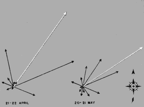 A fundamental difficulty in the pressure-pattern theory of migration has no doubt already suggested itself to the reader. The difficulty to which I refer is made clear by asking two questions. How can the birds ever get where they are going if they are dependent upon the whim of the winds? How can pressure-pattern flying be reconciled with the precision birds are supposed to show in returning year after year to the same nesting area? The answer is, in part, that, if the wind is a major controlling influence on the routes birds follow, there must be a rather stable pattern of air currents prevailing from year to year. Such a situation does in fact exist. There are maps showing wind roses at 750 and 1,500 meters above mean sea level during April and May (Stevens, 1933, figs. 13-14, 17-18). Similarly, the "Airway Meteorological Atlas for the United States" (Anonymous, 1941) gives surface wind roses for April (Chart 6) and upper wind roses at 500 and 1,000 meters above mean sea level for the combined months of March, April, and May (Charts 81 and 82). The same publication shows wind resultants at 500 and 1,000 meters above mean sea level (Charts 108 and 109). Further information permitting a description in general terms of conditions prevailing in April and May is found in the "Monthly Weather Review" covering these months (cf. Anonymous, 1948 a, Charts 6 and 8; 1948 b, Charts 6 and 8).