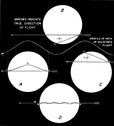 Whatever we do, computed individual flight directions must be frankly recognized as approximations. Their anticipated inaccuracies are not the result of defects in the mathematical procedure employed. This is rigorous. The difficulty lies in the impossibility of reading the slants of the pathways on the moon precisely and in the three-dimensional nature of movement through space. The observed coördinates of birds' pathways across the moon are the projected product of two component angles—the compass direction of the flight and its slope off the horizontal, or gradient. These two factors cannot be dissociated by any technique yet developed. All we can do is to compute what a bird's course would be, if it were flying horizontal to the earth during the interval it passes before the moon. We cannot reasonably assume, of course, that all nocturnal migration takes place on level planes, even though the local distractions so often associated with sloping flight during the day are minimized in the case of migrating birds proceeding toward a distant destination in darkness. We may more safely suppose, however, that deviations from the horizontal are random in nature, that it is mainly a matter of chance whether the observer happens to see an ascending segment of flight or a descending one. Over a series of observations, we may expect a fairly even distribution of ups and downs. It follows that, although departures from the horizontal may distort individual directions, they tend to average out in the computed trend of the mean. The working of this principle applied to the undulating flight of the Goldfinch (Spinus) is illustrated in Figure 9.