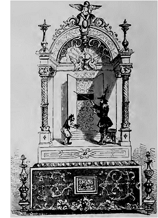 Aux portes d'un temple construit dans le style de la Renaissance et supporté par un magnifique meuble en bois d'ébène sculpté, enrichi d'ornements en bronze doré, est assis un nécromancien de même grandeur que le petit musicien, tenant d'une main la baguette magique, et de l'autre le livre du destin.