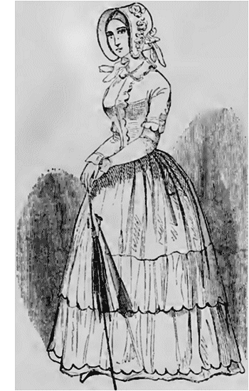 «Dans une promenade aux ruines du vieux château de B..., madame la comtesse de L.... portait une robe de batiste à raies bleues et blanches; le corsage était demi-décolleté en coeur, jusqu'à la ceinture; des pattes en étoile, bordées d'une petite passementerie, rattachaient en échelle et s'élargissaient en montant, laissant voir à demi un fichu de mousseline plissée à très-petit col de dentelle. Les manches, justes à jockey, étaient ornées de sous-pattes pareilles à l'ornement du corsage. Un chapeau de paille d'Italie avec une plume blanche couchée sur la passe, et un châle de mousseline tarlatane complétaient ce costume champêtre.»