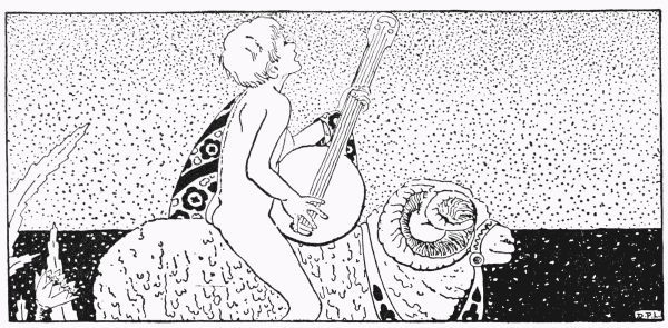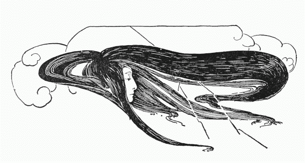 Now, looking abroad over the earth, it appeared to Martin that the thousands and tens and hundreds of thousands of fragments of mist, had the shapes of men, and were like an innumerable multitude of gigantic men with shining white faces and shining golden hair and long cloud-like robes of a pearly grey colour, that trailed on the earth as they moved. They were like a vast army covering the whole earth, all with their faces set towards the west, all moving swiftly and smoothly on towards the west. And he saw that every one held his robes to his breast with his left hand, and that in his right hand, raised to the level of his head, he carried a strange object. This object was a shell—a big sea-shell of a golden yellow colour with curved pink lips; and very soon one of the mist people came near him, and as he passed by the rock he[158] held the shell to Martin's ear, and it sounded in his ear—a low, deep murmur as of waves breaking on a long shingled beach, and Martin knew, though no word was spoken to him, that it was the sound of the sea, and tears of delight came to his eyes, and at the same time his heart was sick and sad with longing for the sea.