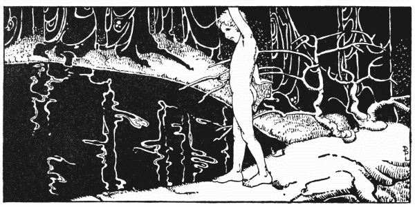 There he lay exhausted, stretched out at full length, so tossed about on the billows that he had a sensation of being in a swing; but the sea grew quiet at last, and when he looked up it was dark, the stars glittering in the dim blue vault above, and the smooth, black water reflecting them all round him, so[178] that he seemed to be floating suspended between two vast, starry skies, one immeasurably far above, the other below him. All night, with only the twinkling, trembling stars for company, he lay there, naked, wet, and cold, thirsty with the bitter taste of sea-salt in his mouth, never daring to stir, listening to the continual lapping sound of the water.